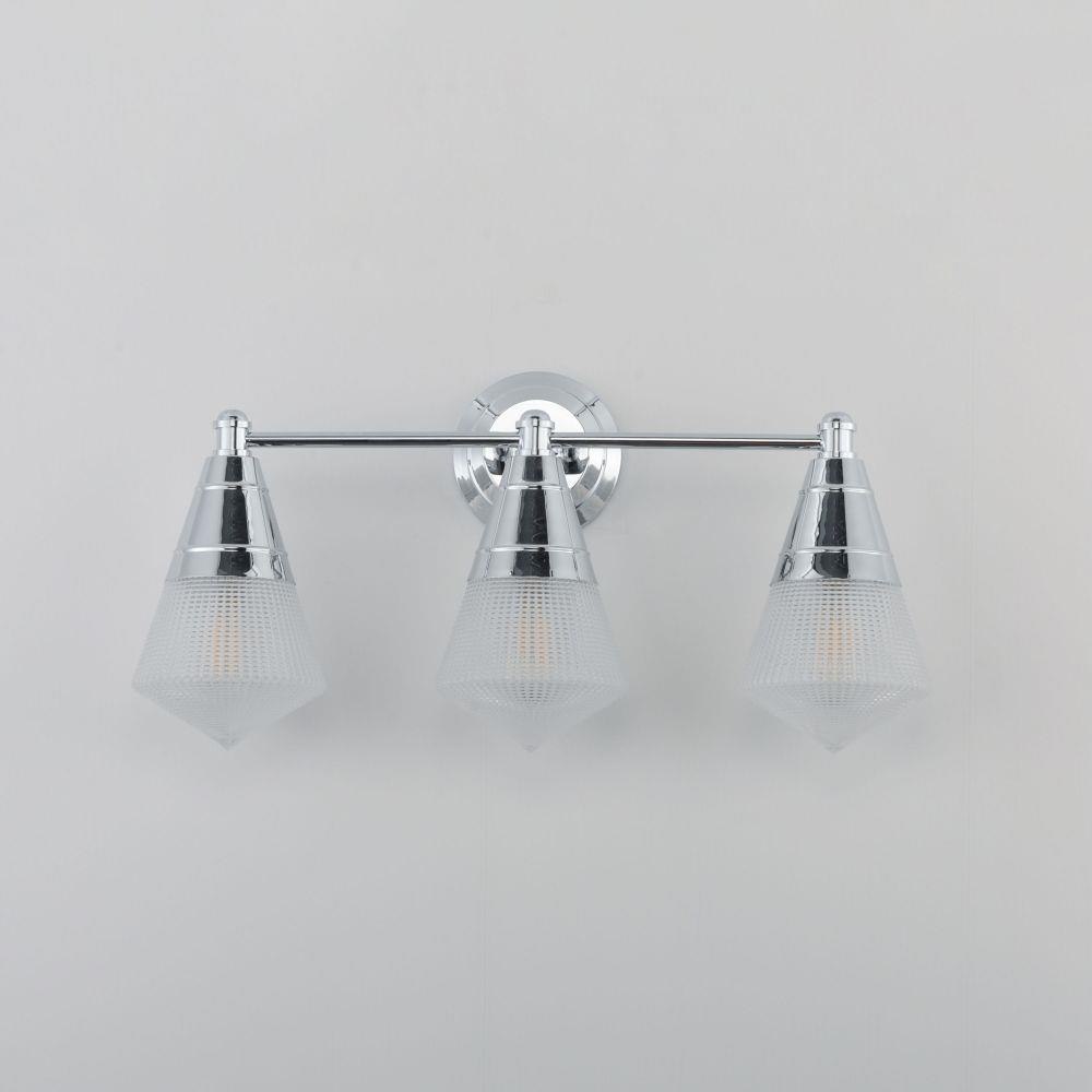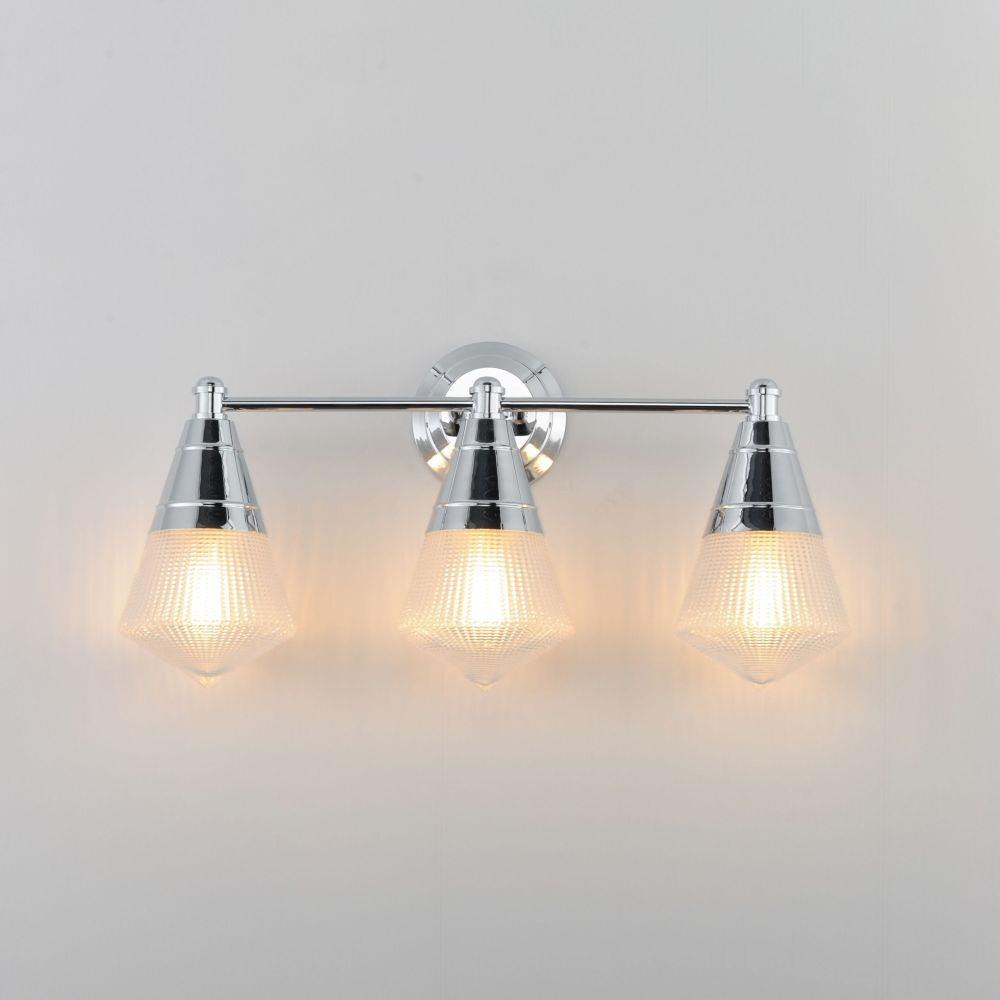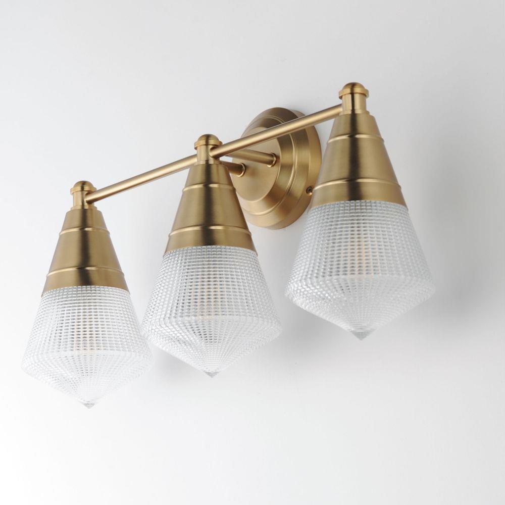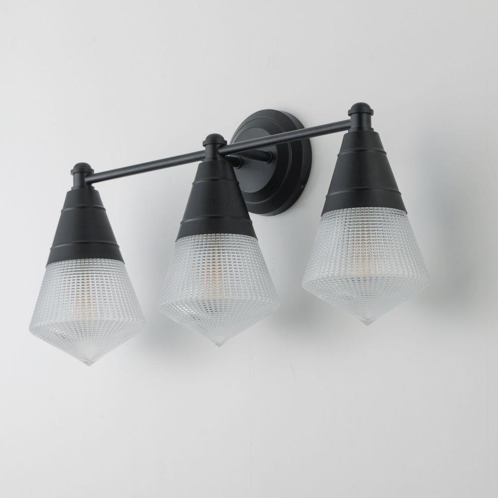 A prismatic diffusion of light is housed within pressed cone glass shades. Choose from pendants with tapered metal halves that conceal the light source or glass shades that are supported by a metal ring. Coordinating bath vanity lights complete the collection.