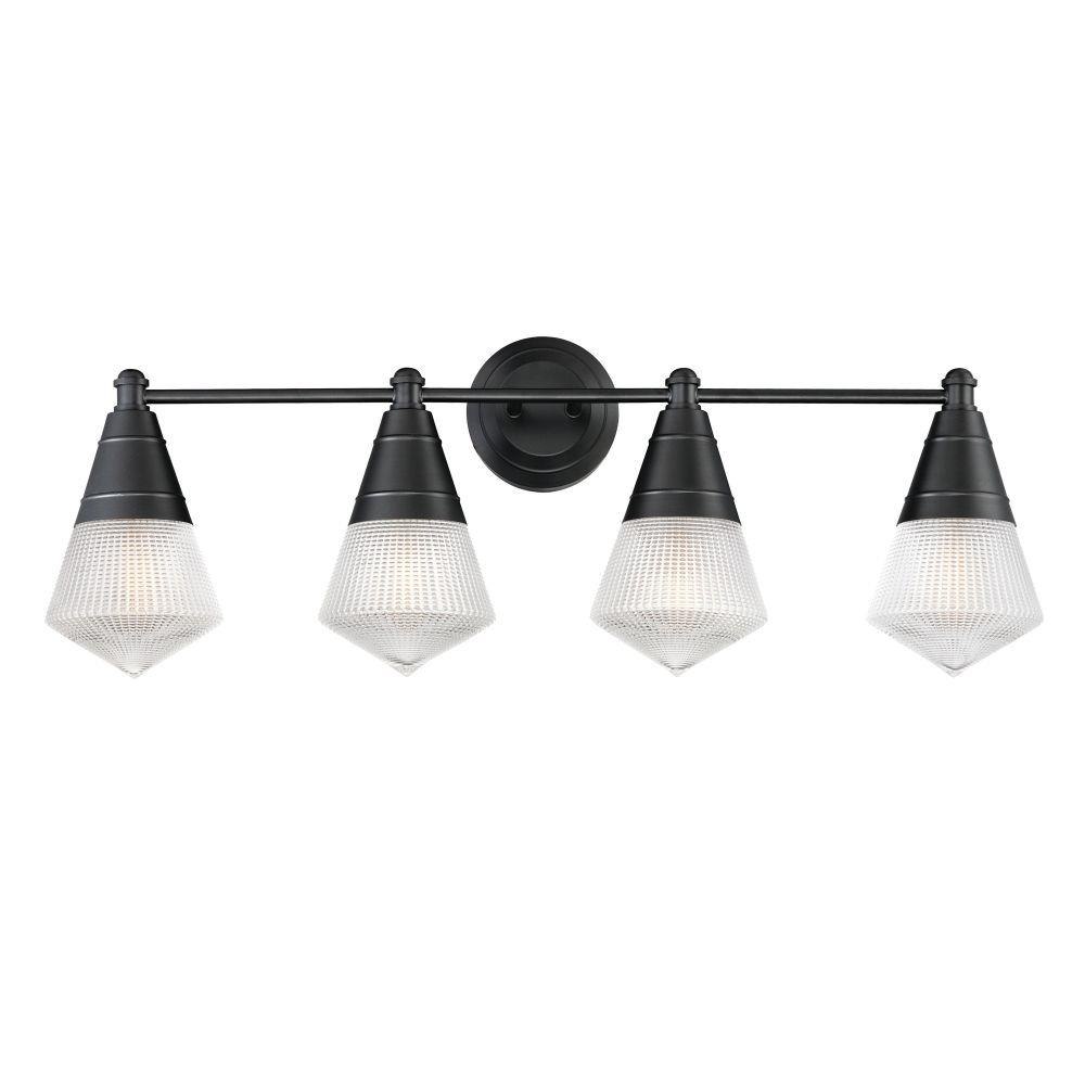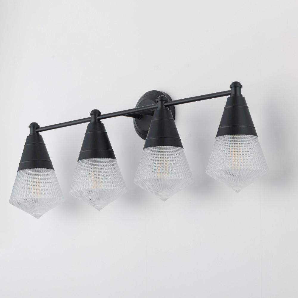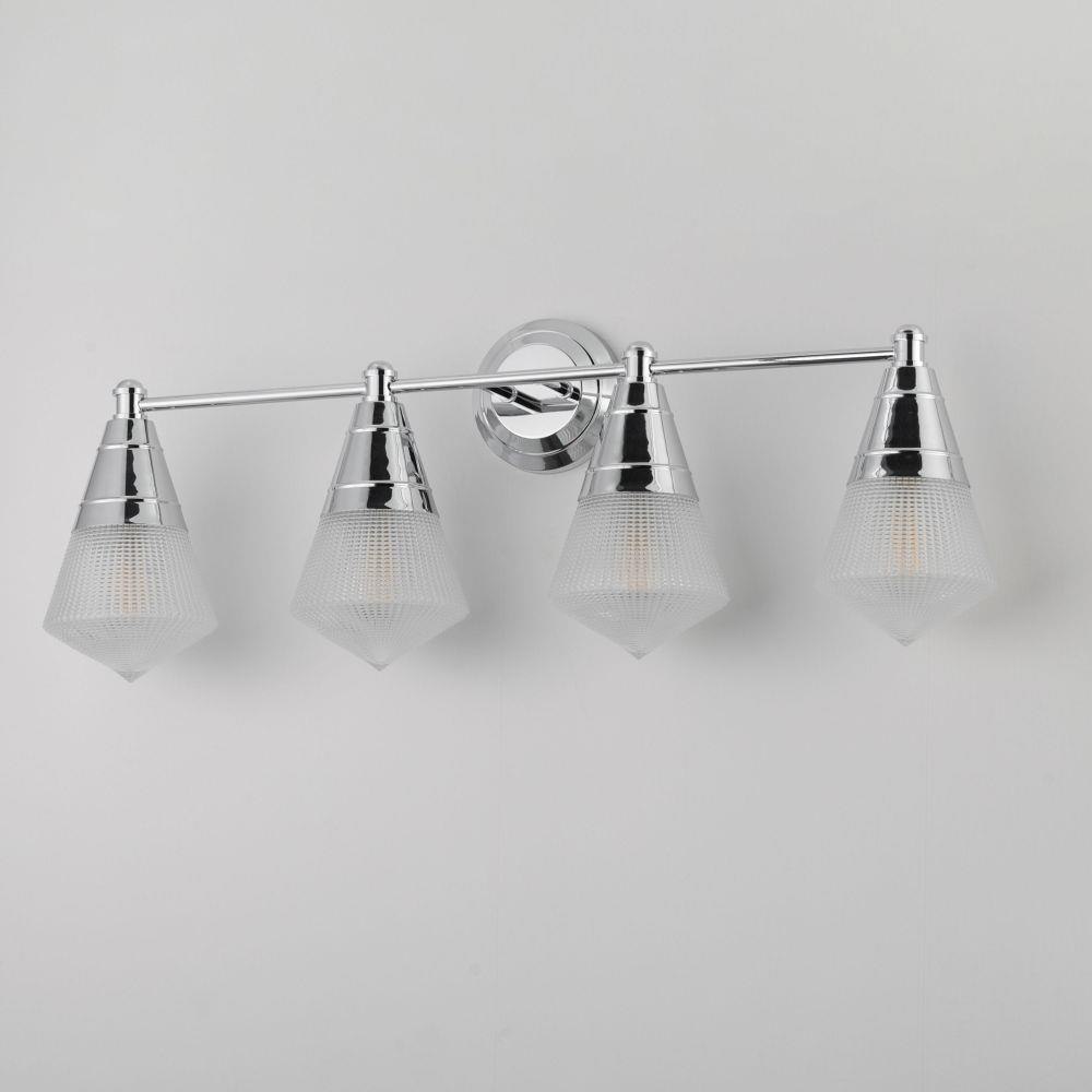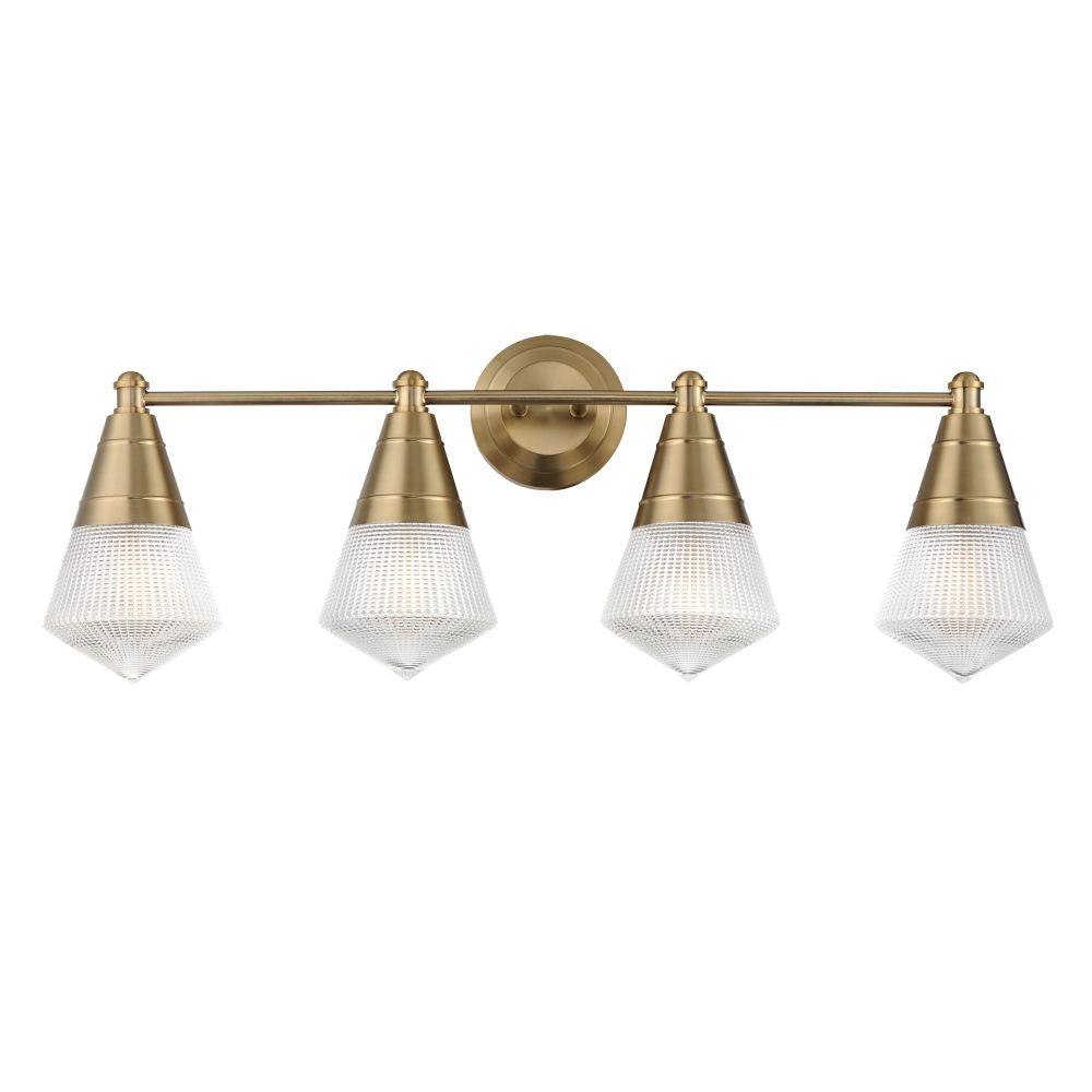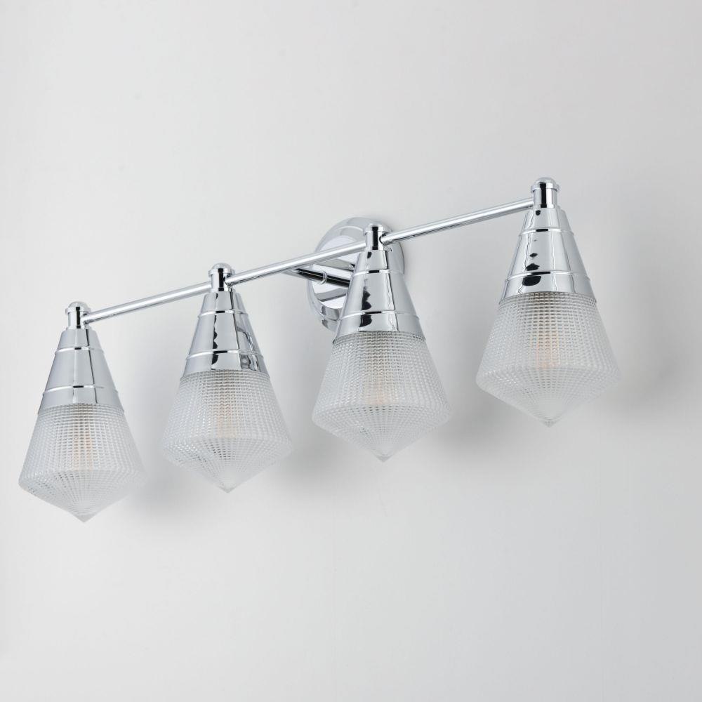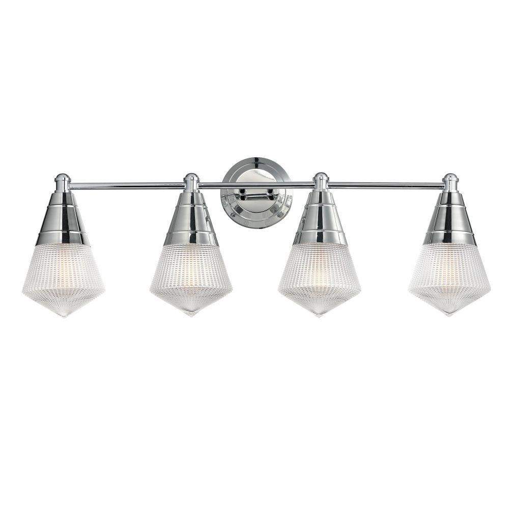 A prismatic diffusion of light is housed within pressed cone glass shades. Choose from pendants with tapered metal halves that conceal the light source or glass shades that are supported by a metal ring. Coordinating bath vanity lights complete the collection.