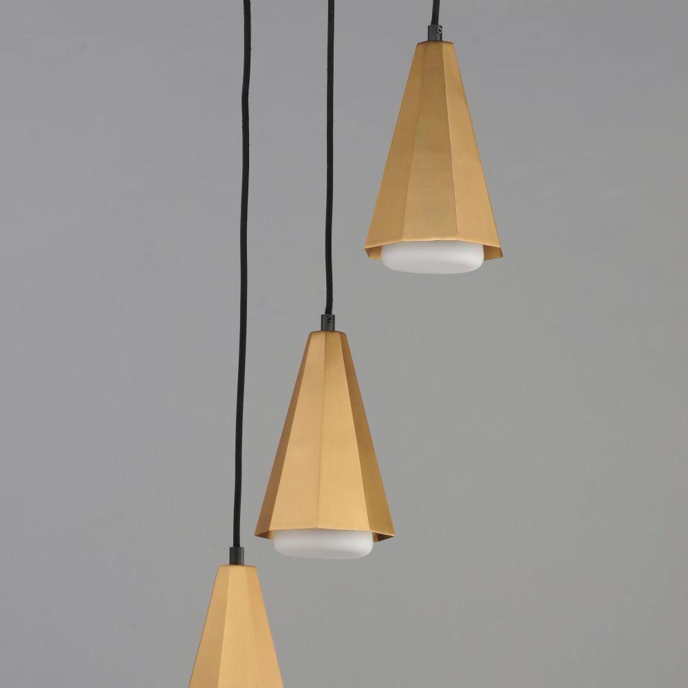 The Rizzo collection exudes stylish flair and spirited design, combining faceted metal shades in Natural Aged Brass with striking Matte Black accents. A flat-bottomed Satin White glass shade protrudes gracefully from the base of each metal shade, delivering soft, inviting light with a touch of elegance. Available in a variety of versatile configurations, the collection includes an articulating 4-arm chandelier, two sizes of stem-hung linear pendants, cord-hung multi-mini pendants, a sleek wall sconce, and a bold, coordinating flush mount. Elevate any space with Rizzo's perfect balance of timeless sophistication and modern edge.