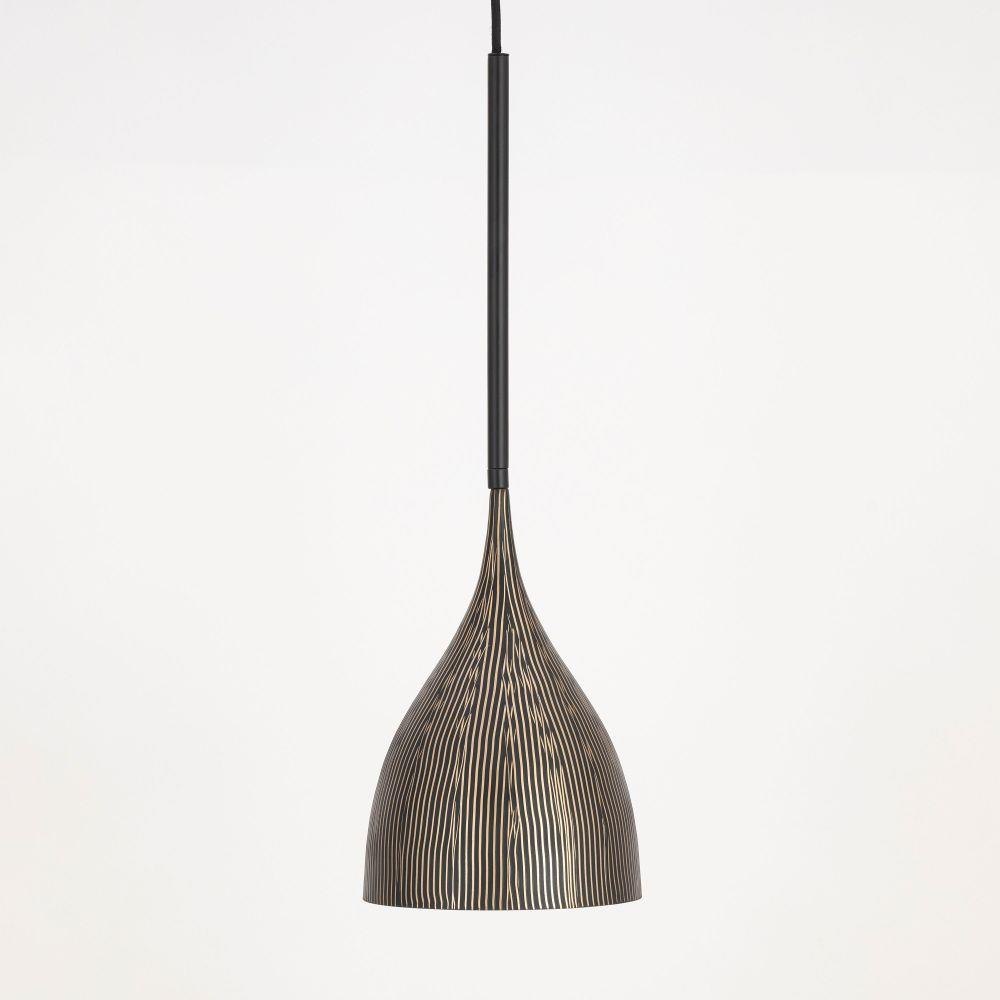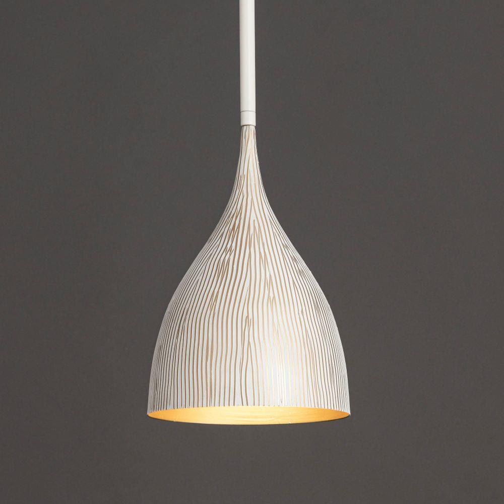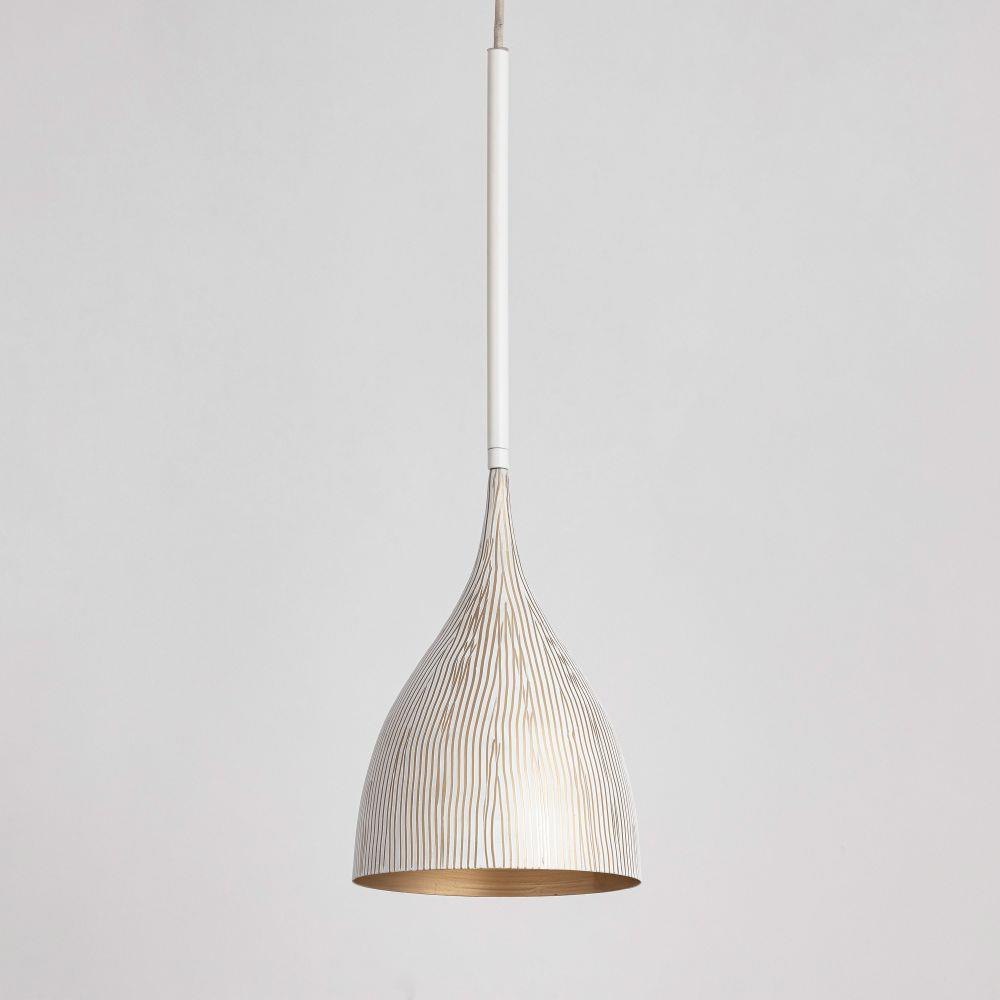 Graceful and sculptural, Fleur's gently flared silhouette brings a sense of quiet sophistication to any space. Hand-spun metal shades are adorned with a striated finish, scraped by hand to reveal glowing Gold undertones beneath layers of Matte Black or White. A matching Gold interior warms the light within, while a coordinating fabric cord suspends them for convenient height adjustments. Offered in multiple pendant sizes and a flush mount, Fleur offers tailored elegance to interior spaces such as entries and over a kitchen island.