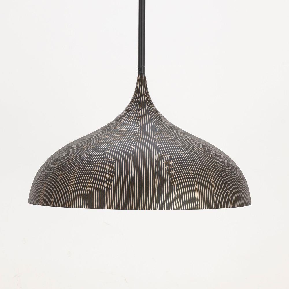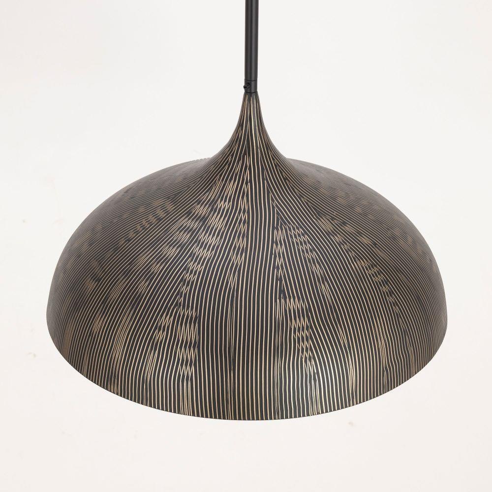 Graceful and sculptural, Fleur's gently flared silhouette brings a sense of quiet sophistication to any space. Hand-spun metal shades are adorned with a striated finish, scraped by hand to reveal glowing Gold undertones beneath layers of Matte Black or White. A matching Gold interior warms the light within, while a coordinating fabric cord suspends them for convenient height adjustments. Offered in multiple pendant sizes and a flush mount, Fleur offers tailored elegance to interior spaces such as entries and over a kitchen island.