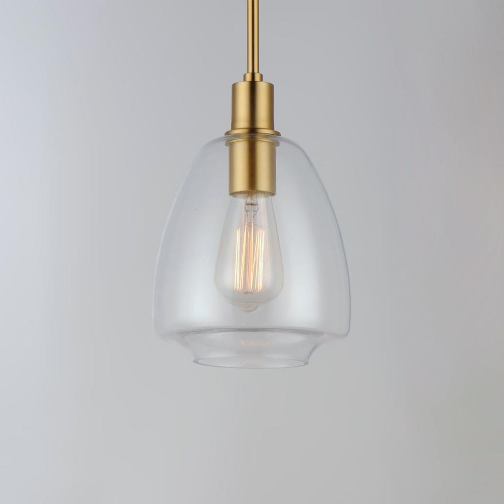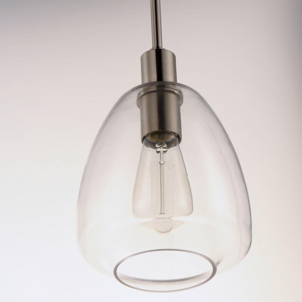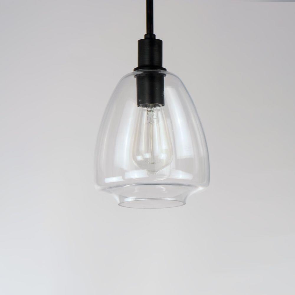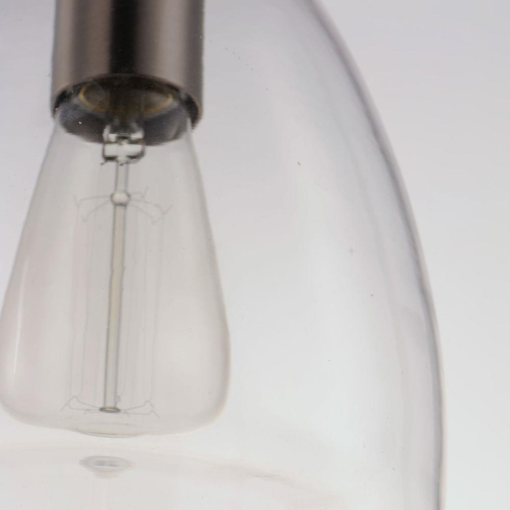 Pendants of Clear glass in unique elongated and undulating shapes with various sizes. This series pairs well with popular finishes in hardware and plumbing, giving you the flexibility to take chances with designer statement pieces. The metalwork is available in your choice of Matte Black, Satin Brass, or Satin Nickel. A coordinating wall sconce pairs well with the collection. Use filament bulbs to complete the look.