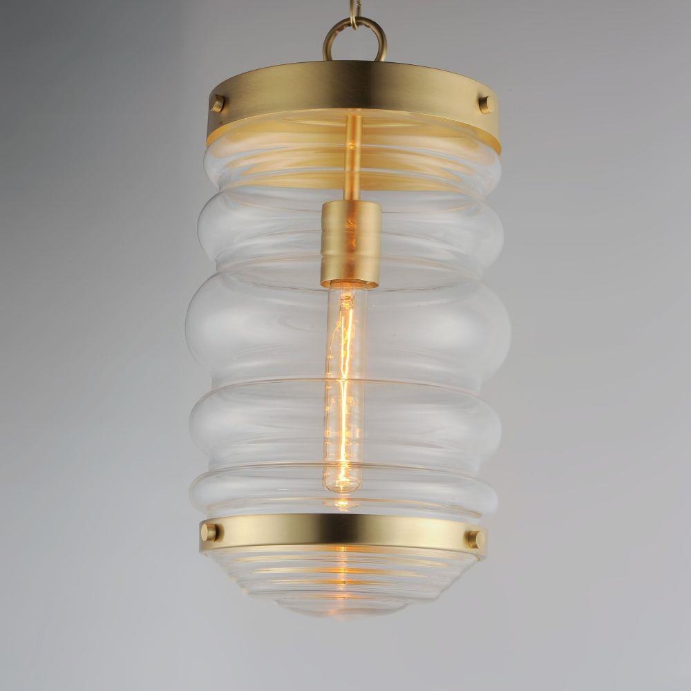 An oversized oscillating, cylinder of Clear Seedy glass adds to a variety of coastal inspired pendants. Three knurled edge set screws support a massive glass with a ribbed bottom. Pair the clear glass shades with tubular filament lamps to complete the look.