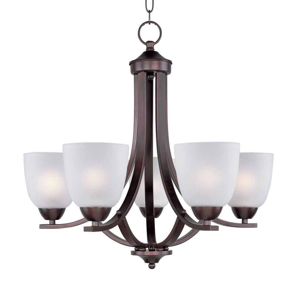 This transitional design works in any style home. Intersecting, rectangular tubing finished in your choice of Satin Nickel or Oil Rubbed Bronze gently curves to support simple line Frost glass shades.