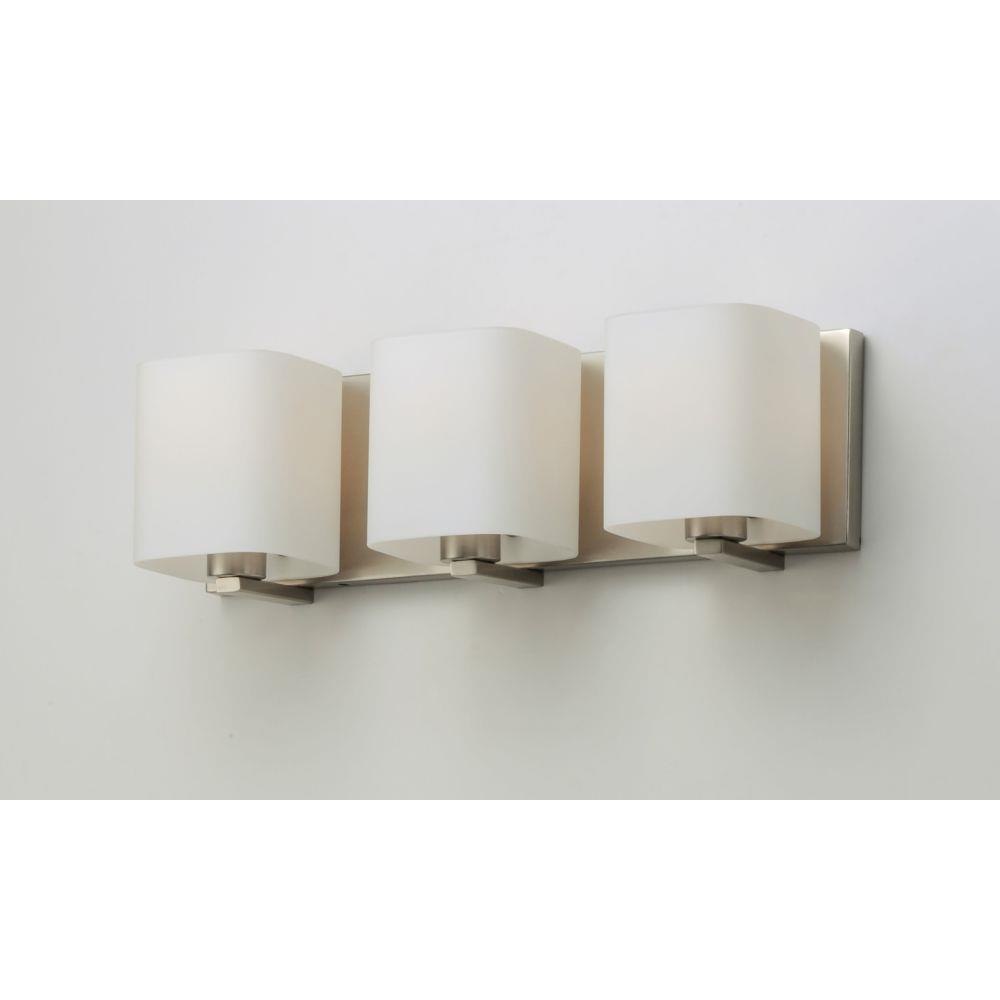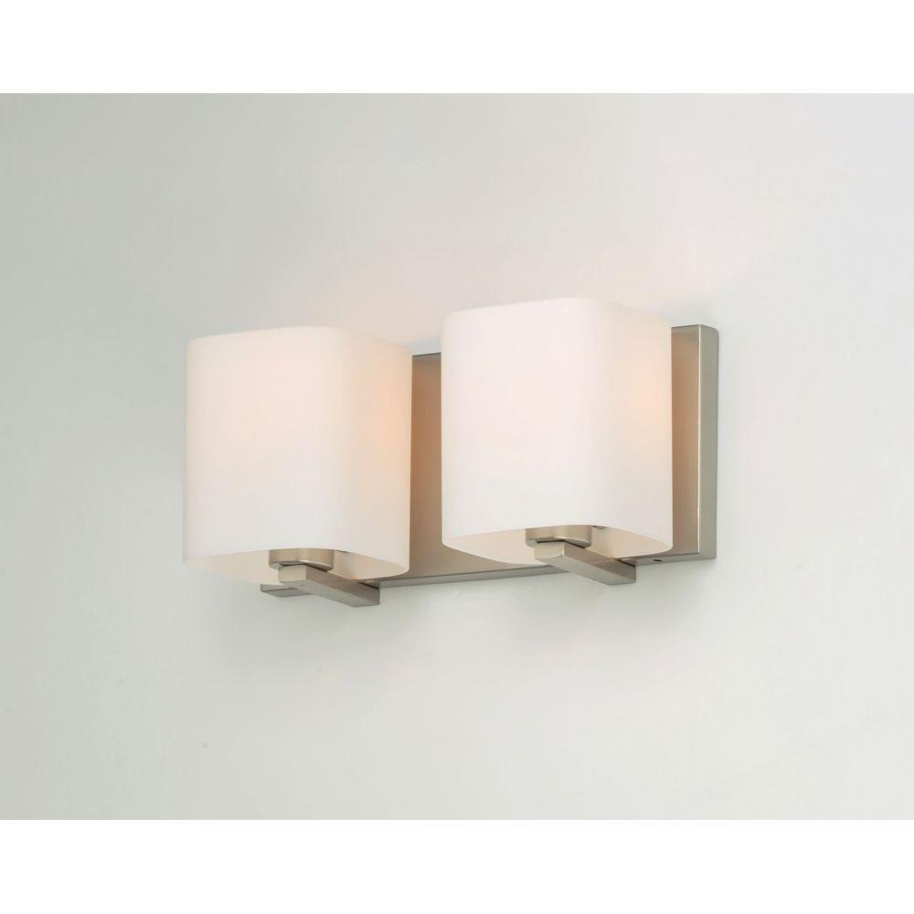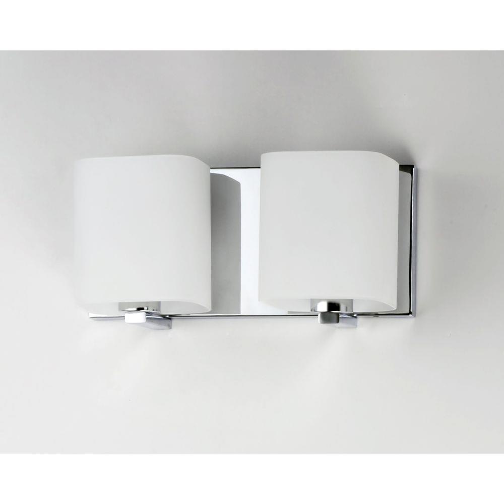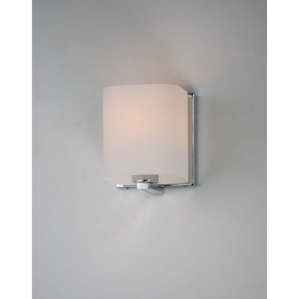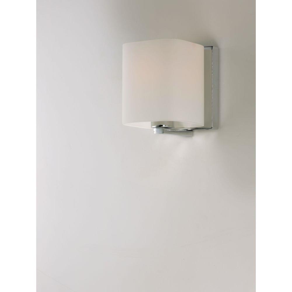 Satin White bands of cased glass wrap around each lamp creating a soft ribbon of light. Back plates finished in Polished Chrome or Satin Nickel complement the majority of bath fittings.