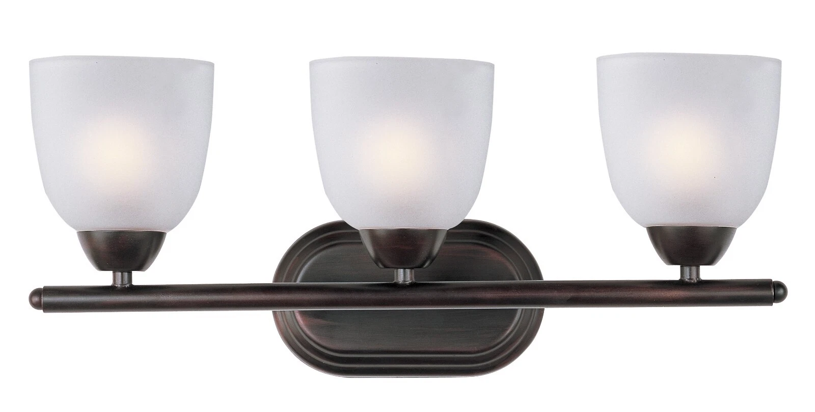 Full length oval backplates support simple bell-shaped, Frosted glass shades. Oil Rubbed Bronze.