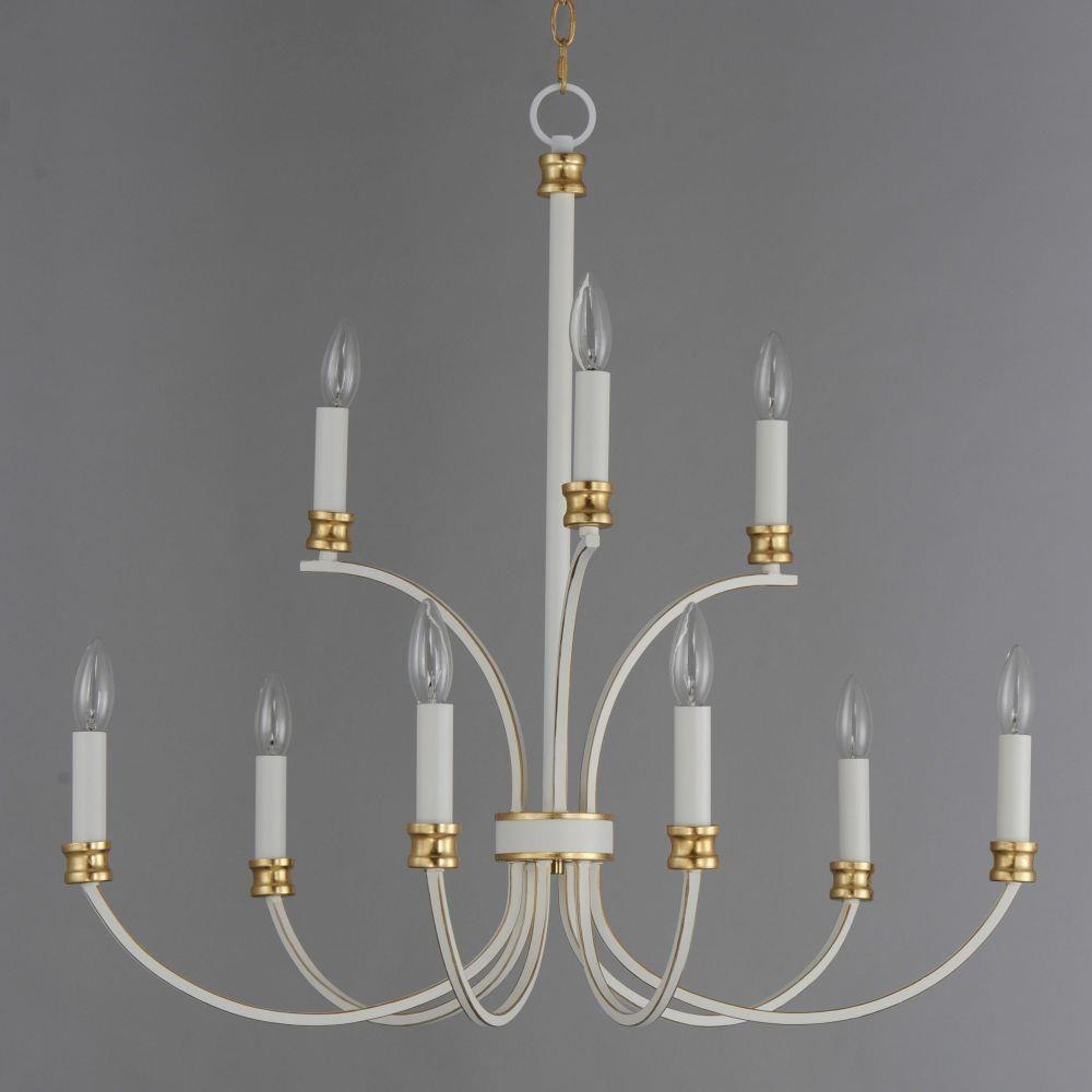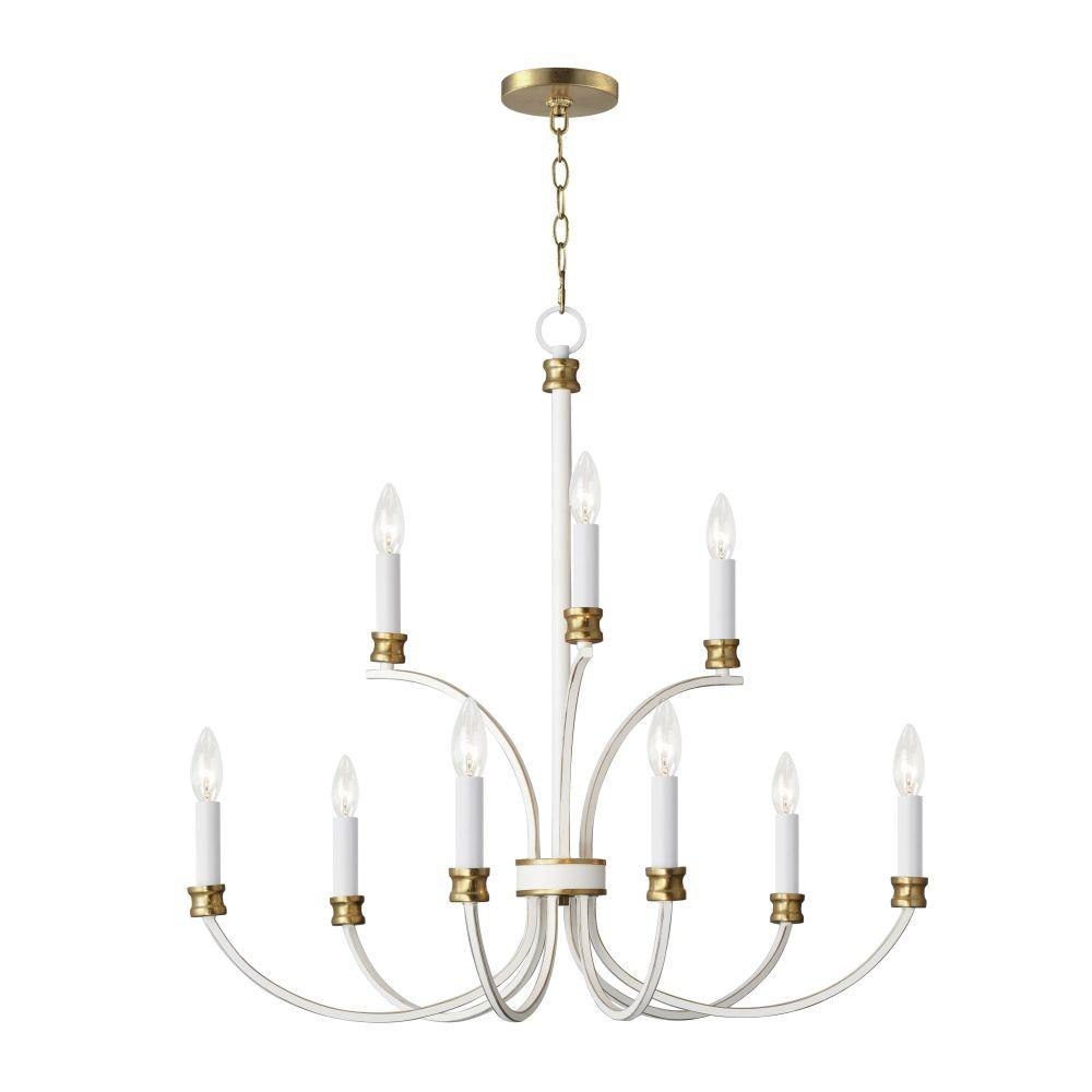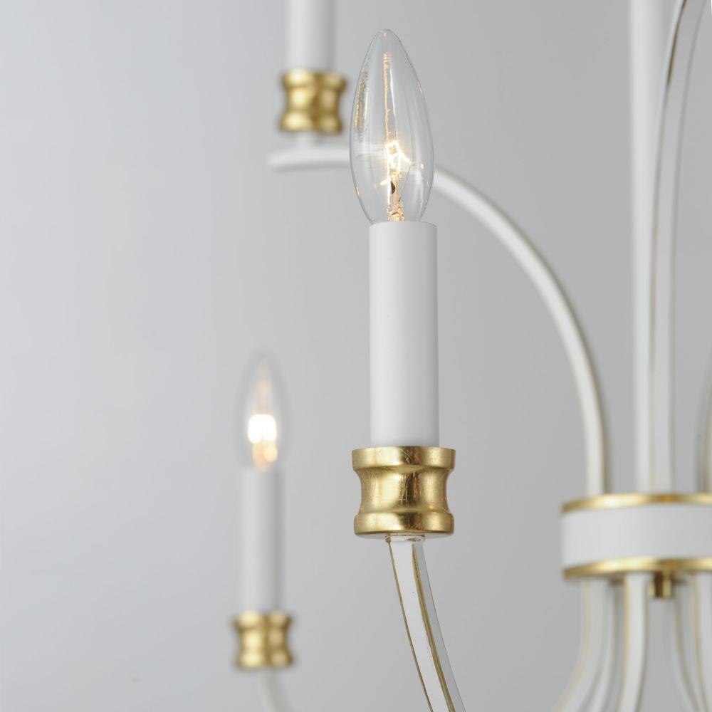 A lovely candelabra style collection with rich accents. This seemingly simple chandelier highlights classically curving accents in a stately combination of Black with Antique Brass accents or chic Weathered White with Gold Leaf accents. Taking a streamlined approach to the archetypal chandelier form, this series updates uses squared tubing to subtly modernize an approachable design with exposed candelabra lighting.