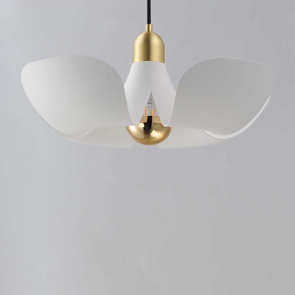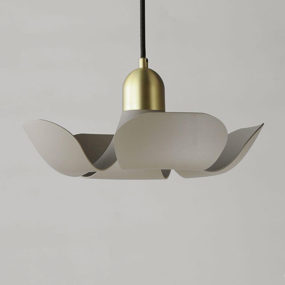 Incurved metal petals of Storm Grey or White finish with Satin Brass caps make oversized biophilic light fixtures. Available as wall sconces or pendants, the various configurations provide playful forms both nostalgic or youthful. Pair with a white G25 lamp or reflector lamp to complete the look.