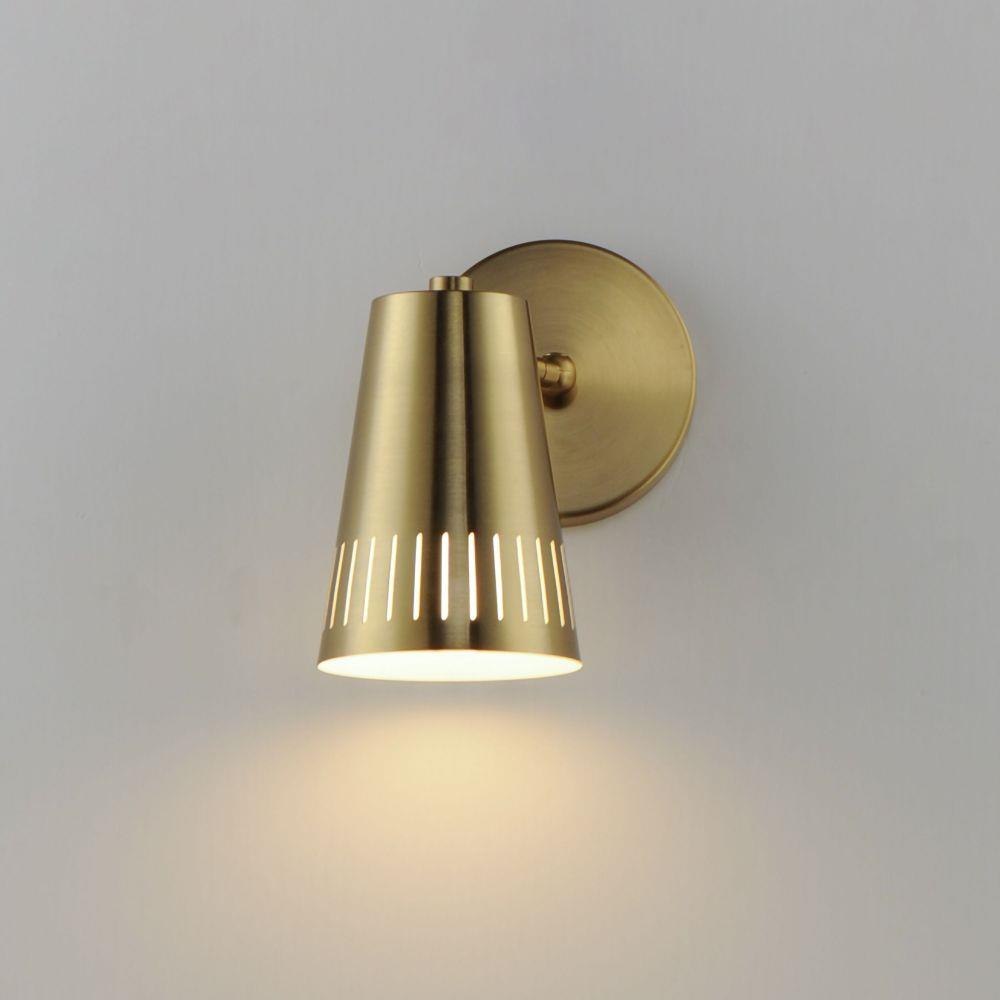 A retro re-imagining of perforated brass shades, this collection is inspired by Scandanavian Mid-Century Modern design. The conical forms feature cut outs along the edge of the shade allowing light to illuminate downward in a spectacular lighting effect. On the ceiling suspended lights, the lighting is cast mostly upwards providing ambient light that washes the ceiling in light, while the sconces are directional providing ample light where needed.