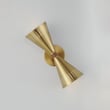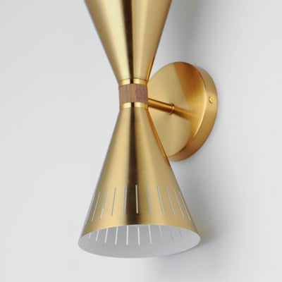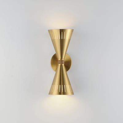 The Helsinki 2-Light Wall Sconce reimagines retro design with its perforated brass shades, drawing inspiration from Scandinavian Mid-Century Modern aesthetics. This elegant sconce enhances any space with its unique conical form and captivating lighting effects.