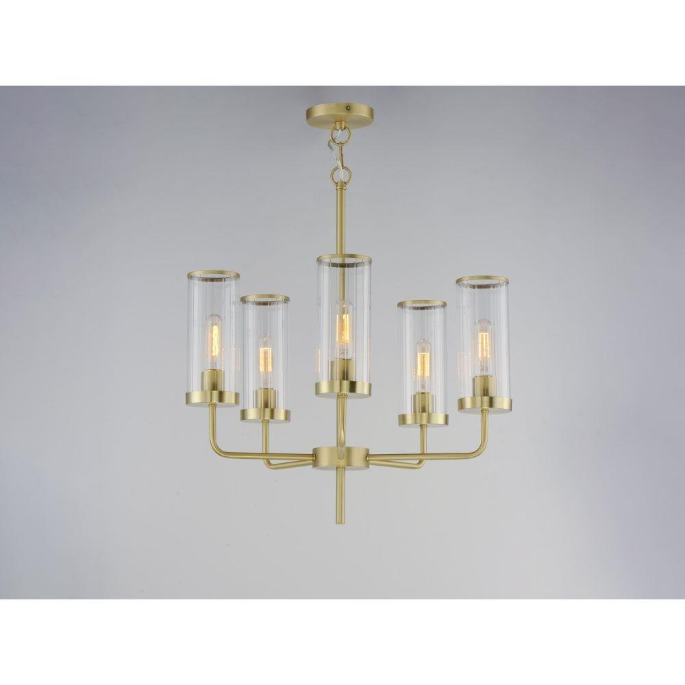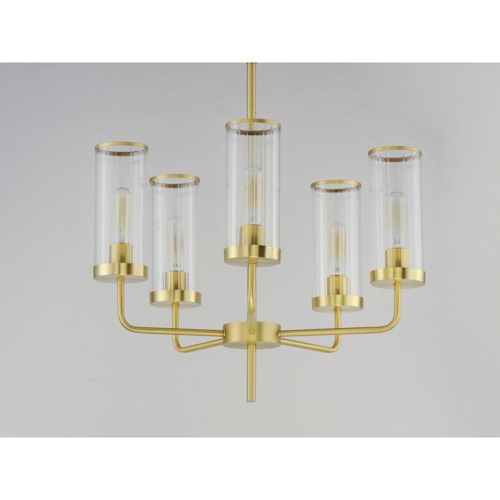 Simple, yet stylish, this minimal chandelier comes in your choice of Satin Brass or Matte Black bringing contemporary appeal. Clear Ribbed glass shades are fitted with rings in a coordinating color to complete the look.