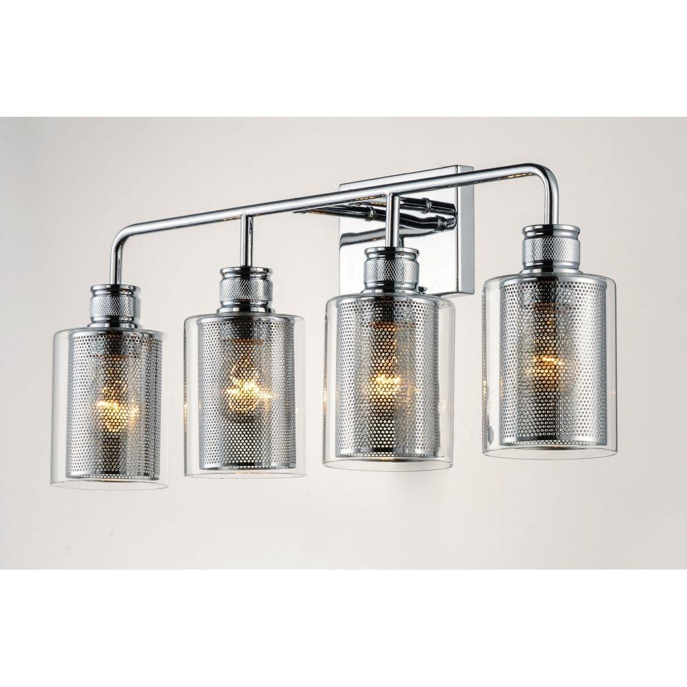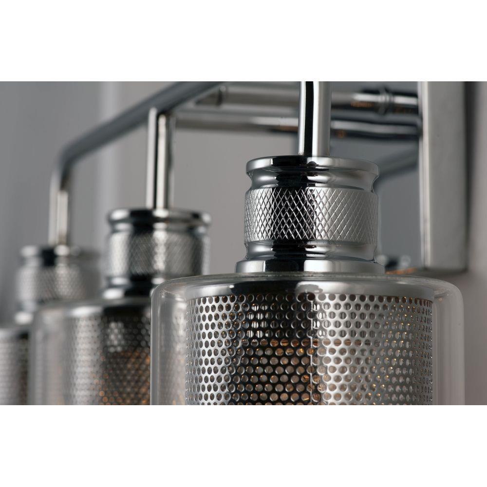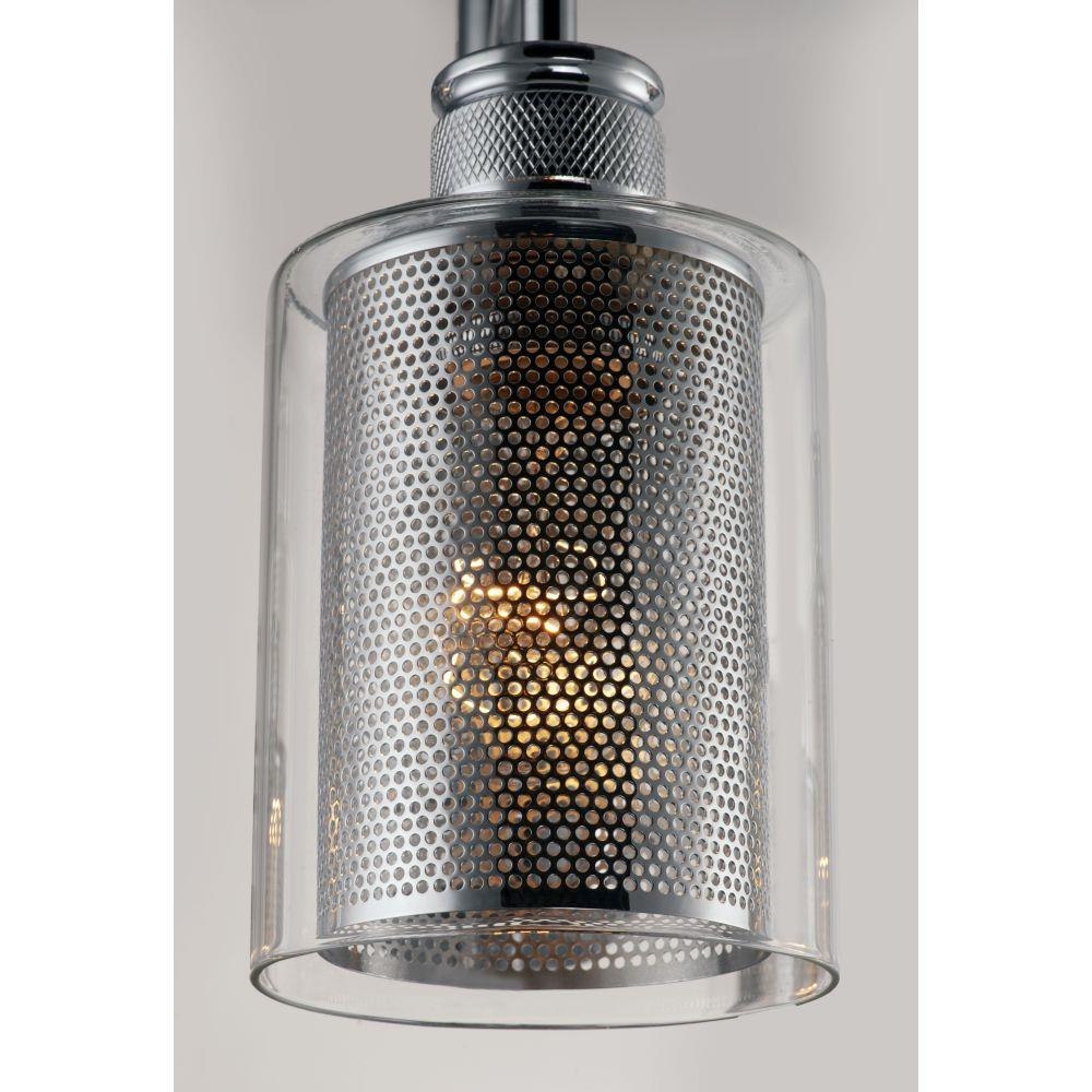 Clear glass cylinders lined with mesh screen are supported by knurled cups of Polished Chrome creates a contemporary design with an industrial twist. This economical collection provides a designer