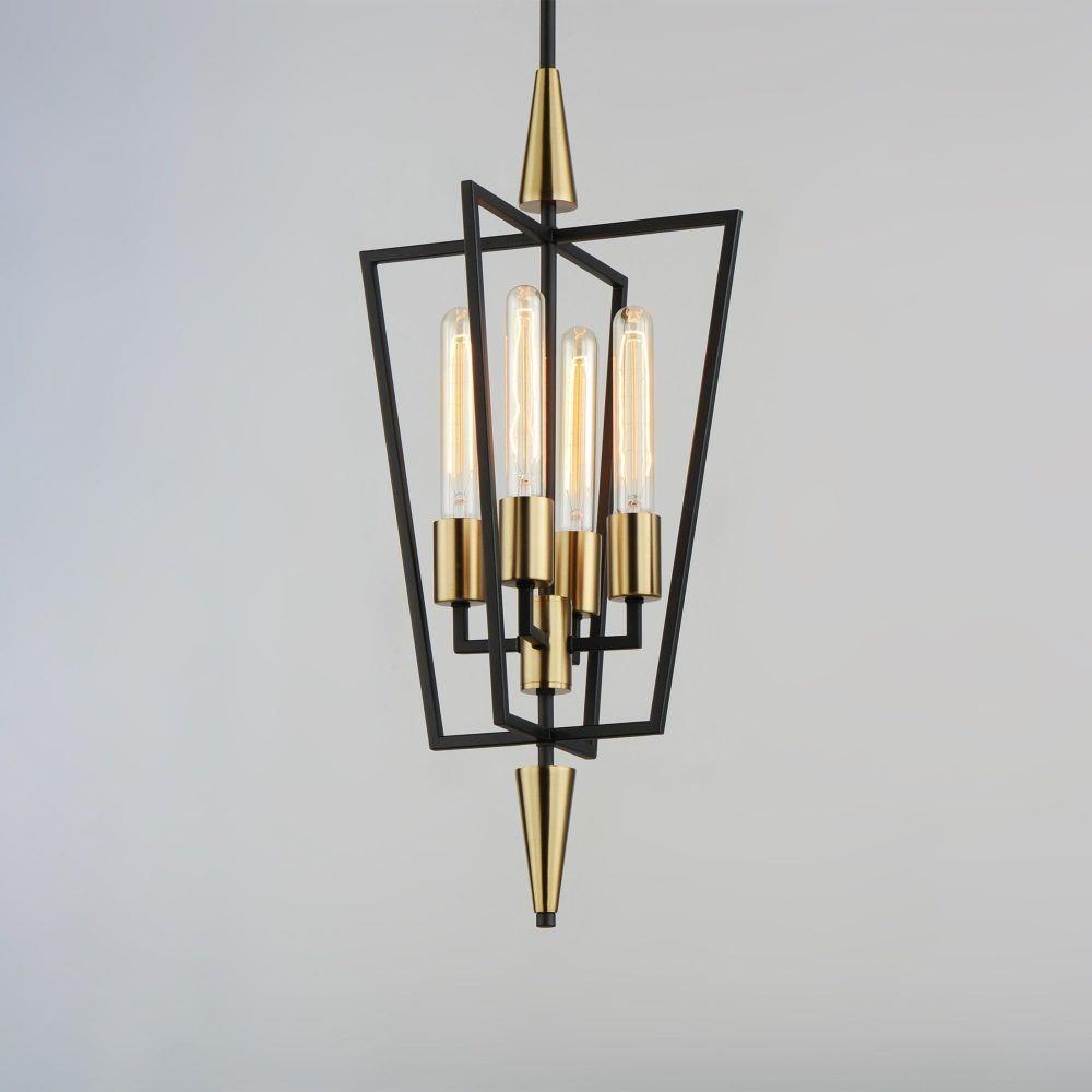 Sharp lines radiate from a pointed pin central body creating geometric angled wings that are sandwiched between matching conical fonts. Finished in a combination Antique Brass and Black, this collection is both contemporary and warm. Complete this look with vintage T10 light bulbs to for the full effect.