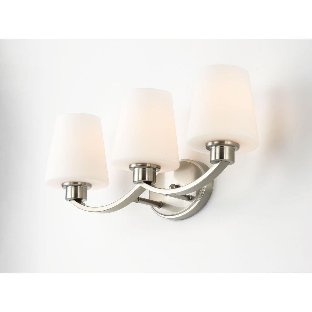Graceful arcs of rectangular tubing transition to round cups that support tapered Satin White glass shades creating a crisp and clean transitional design. The frame is finished in your choice of Satin Nickel or Black which bridges modern and transitional design aesthetics.
