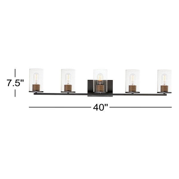 This 5-light vanity fixture brings sleek, modern style to your guest bathroom or main bathroom. Made from steel with a classic black finish, it features a linear silhouette and a rectangular backplate attached to a slim supporting arm. On the arm, five bulb bases suit 60W standard-size bulbs (sold separately), each surrounded by a clear, seeded glass cylinder shade to diffuse light in your bathroom. Plus, it's rated safe for damp locations, and it has reversible mounting options, letting you choose the look that suits your space best.