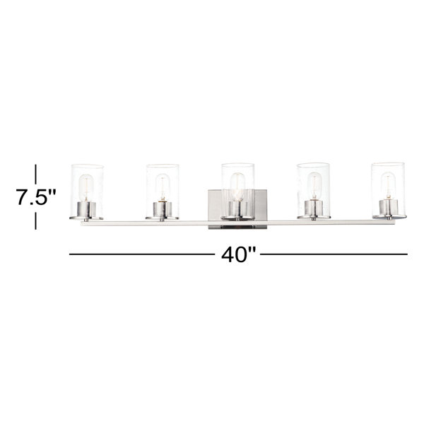 This 5-light vanity fixture infuses a sleek, modern look into your bathroom with its eye-catching hardware and clean-lined silhouette. Made from steel with a satin nickel finish, it includes a rectangular backplate, a thin horizontal bar, and five separate holders. These holders keep in place clear seeded glass drum shades and their respective 60W max bulbs (each sold separately). This vanity light is also compatible with dimmer switches, letting you control the level of brightness in your space. Rated for damp locations, it's safe to install in bathrooms with steamy showers.