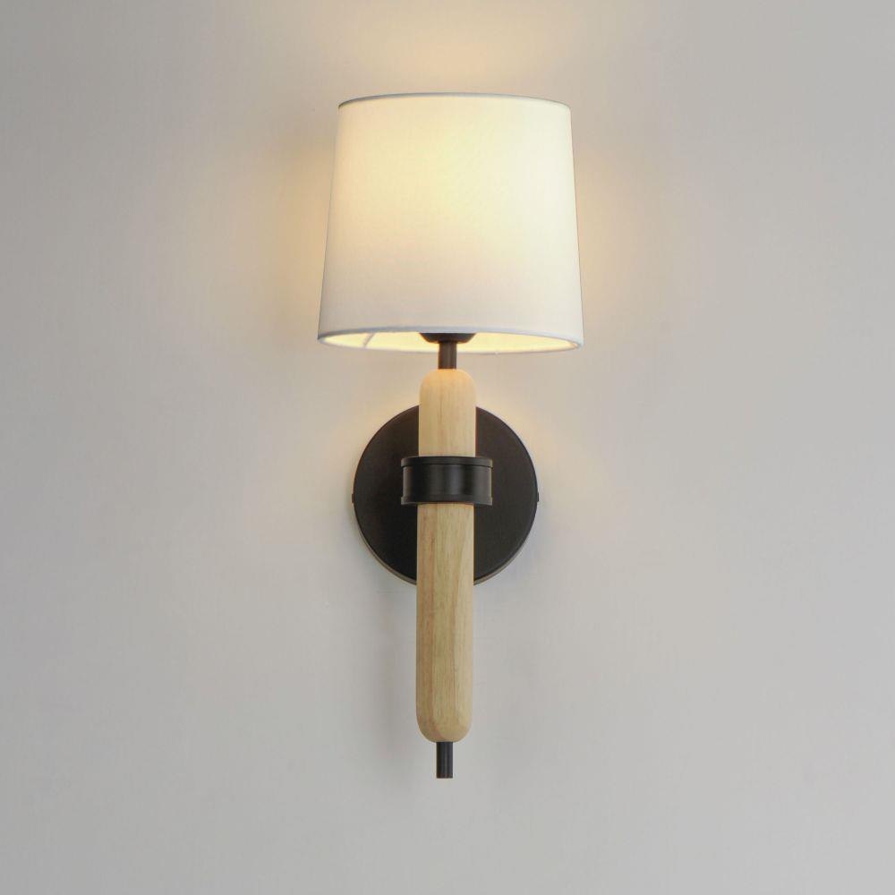 Natural White Oak wood details are featured plainly on a slim Matte Black metal frame. Oversized off-white linen shades cover sockets for a minimalist and natural look. Available in multiple configurations of chandelier and a wall sconce.