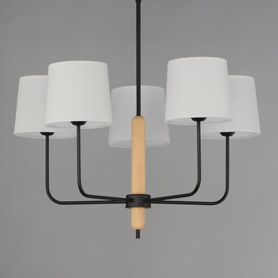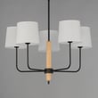 The Bozeman Chandelier combines natural elements with modern design, featuring a sleek Matte Black metal frame accented by Natural White Oak wood details. Oversized off-white linen shades provide a minimalist touch, making it an ideal centerpiece for various settings.