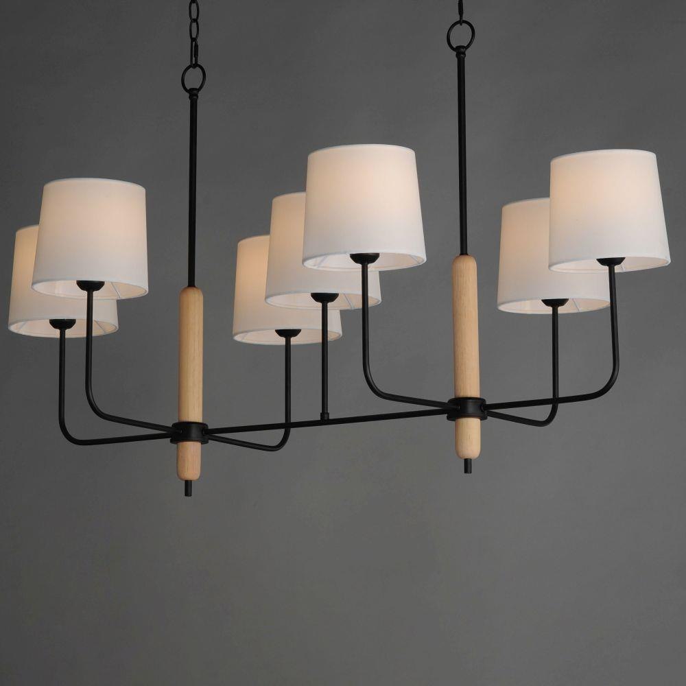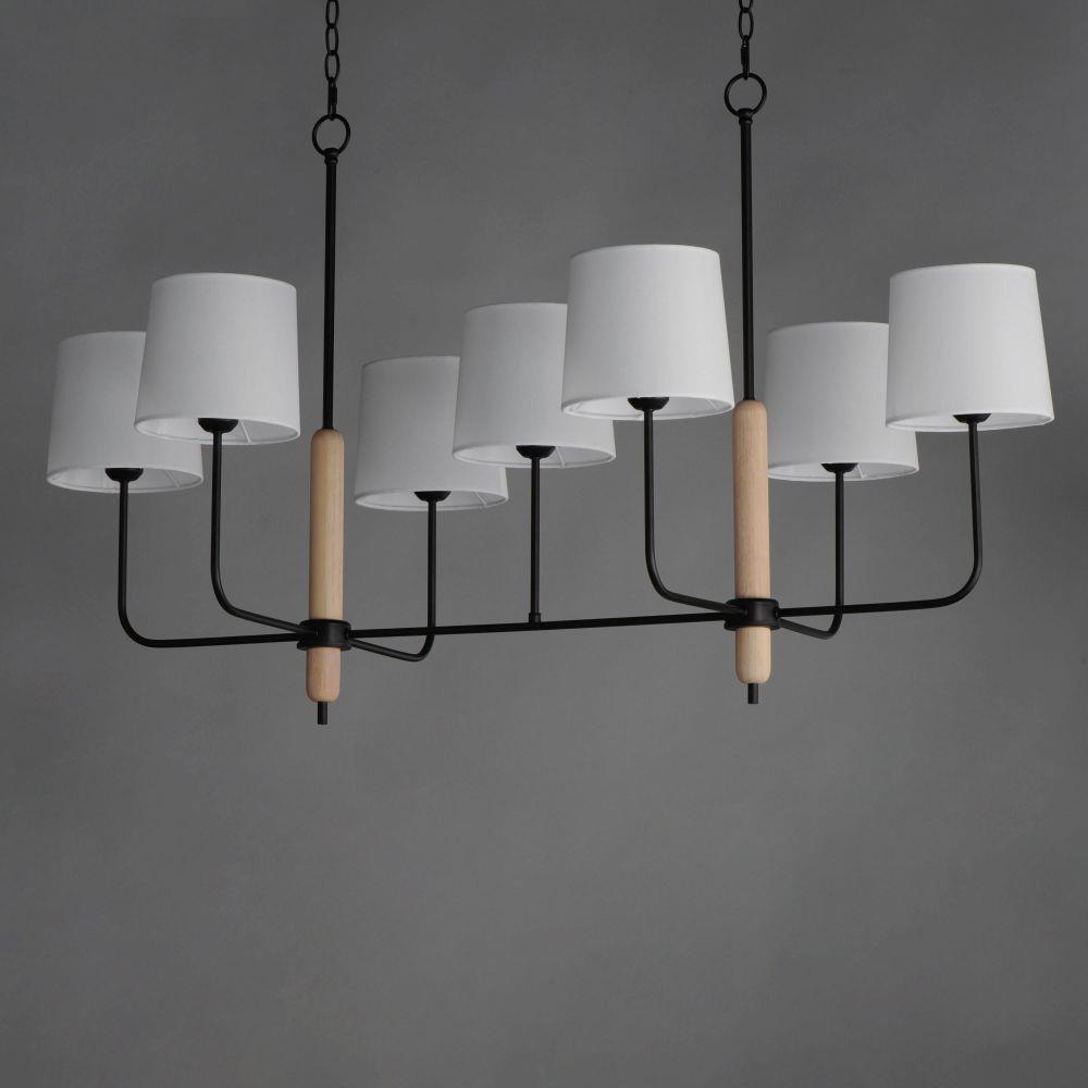 Natural White Oak wood details are featured plainly on a slim Matte Black metal frame. Oversized off-white linen shades cover sockets for a minimalist and natural look. Available in multiple configurations of chandelier and a wall sconce.
