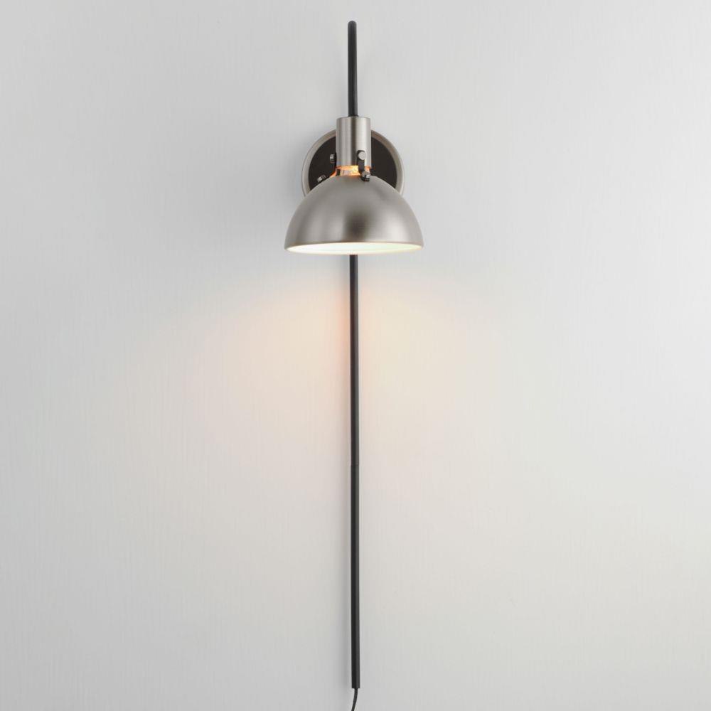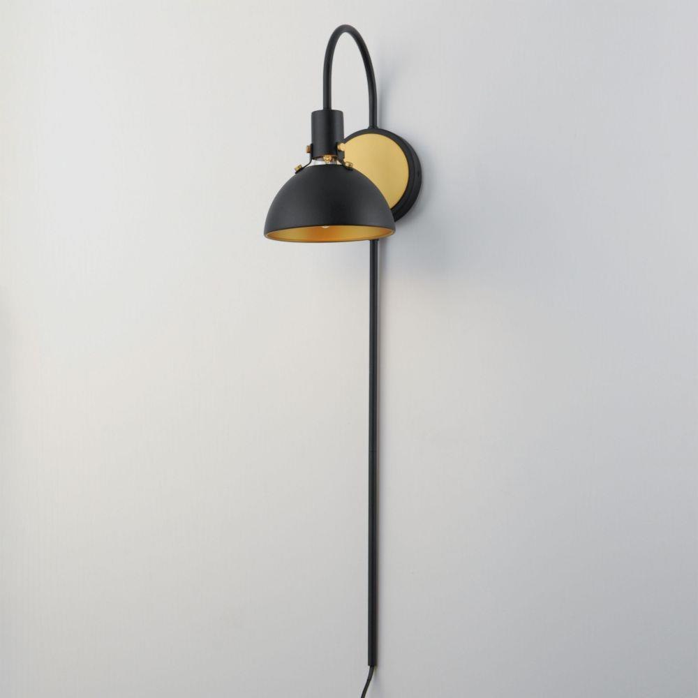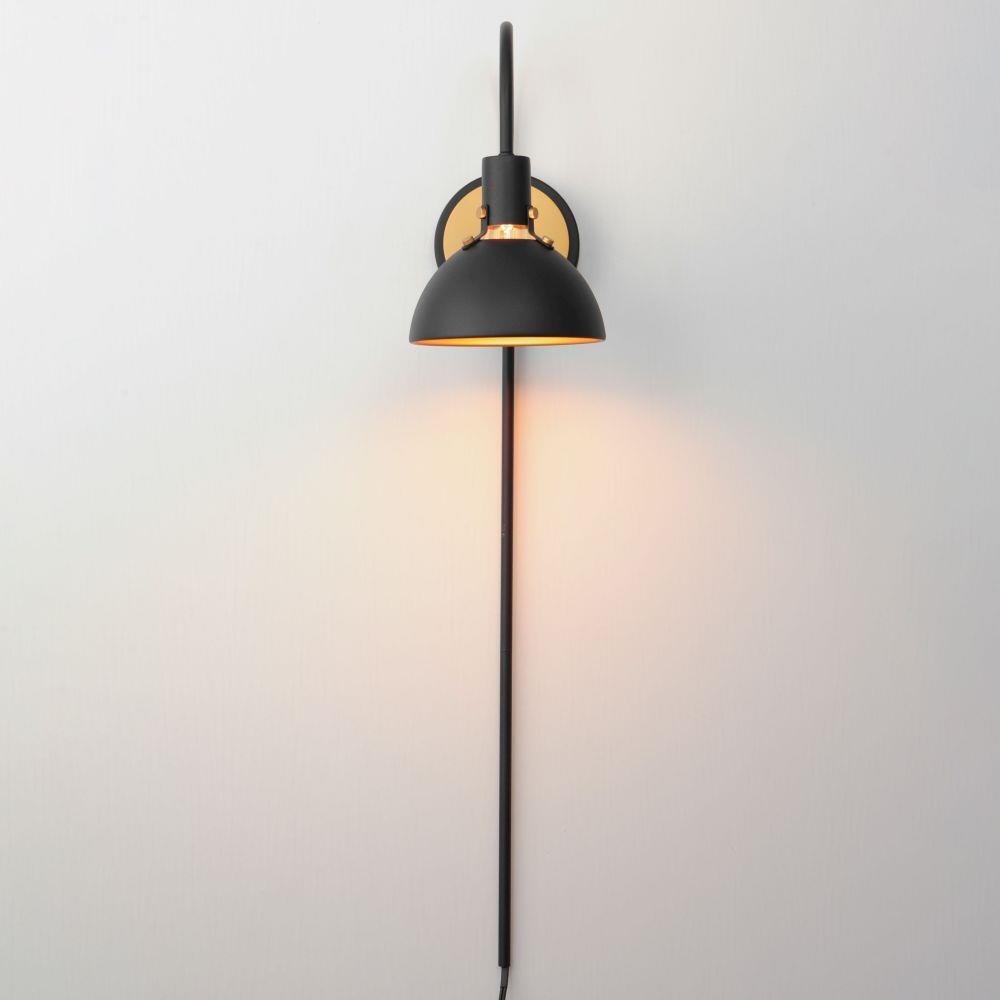 Sockets are suspended above a metal spun dome in your choice of Black or White with Gold accents or Satin Nickel with Black accents. A clean and simple approach to modern or transitional lighting, the opening allows light to shine through the opening atop while providing functional light below. This break in the two parts is supported with straps and decorative rivets in complimentary finishes for a subtlety tasteful two-tone finish. A coordinating pin-up wall sconce offers a bedside application to this design with integrated switch on its back plate and two feet of cord cover that can be removed and hardwired per your preference.