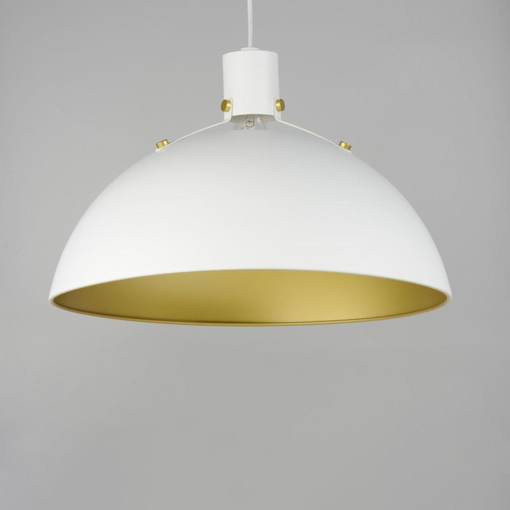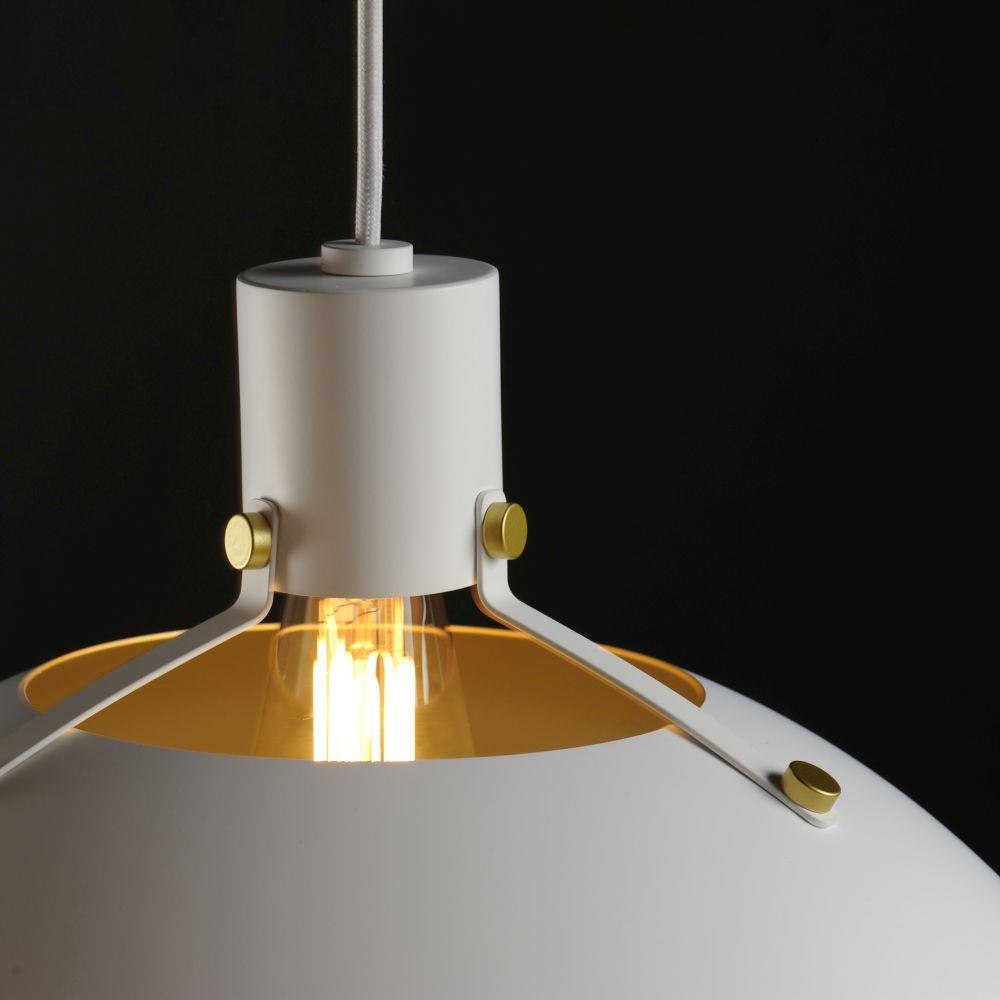 Sockets are suspended above a metal spun dome in your choice of Black or White with Gold accents or Satin Nickel with Black accents. A clean and simple approach to modern or transitional lighting, the opening allows light to shine through the opening atop while providing functional light below. This break in the two parts is supported with straps and decorative rivets in complimentary finishes for a subtlety tasteful two-tone finish. A coordinating pin-up wall sconce offers a bedside application to this design with integrated switch on its back plate and two feet of cord cover that can be removed and hardwired per your preference.