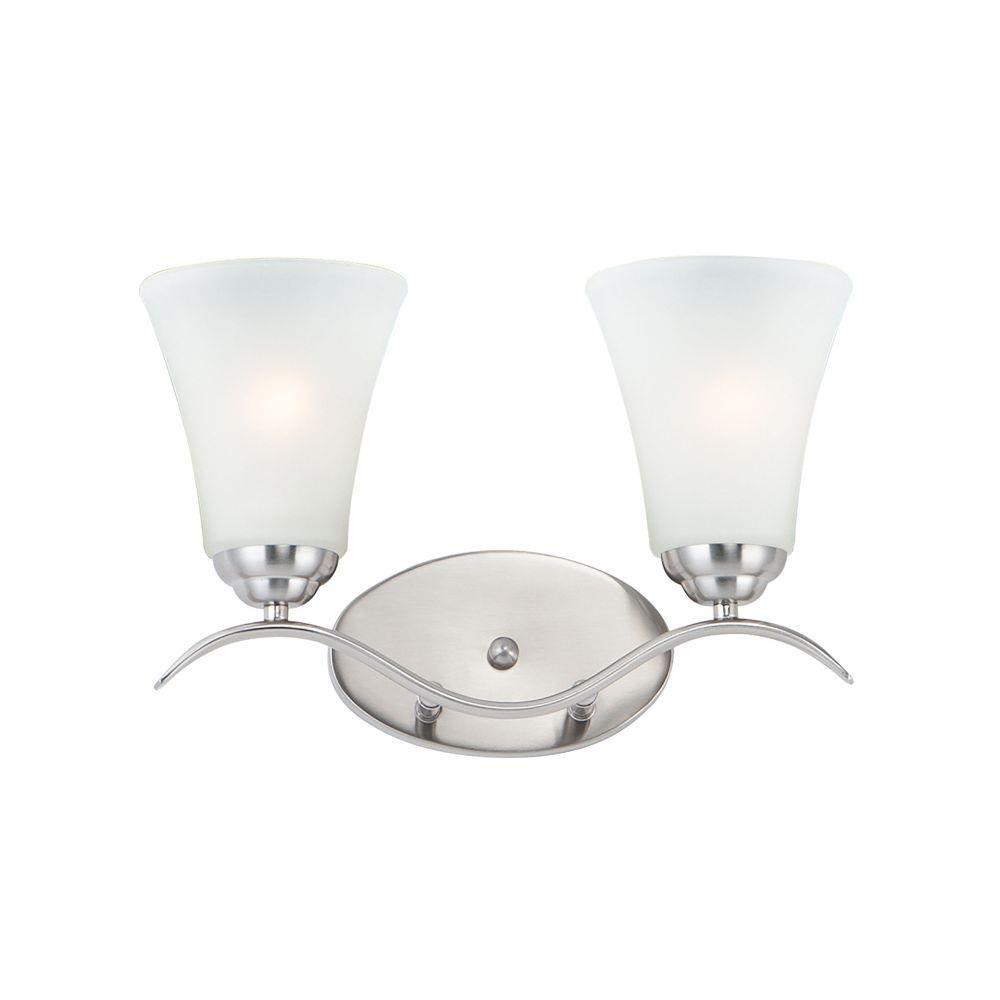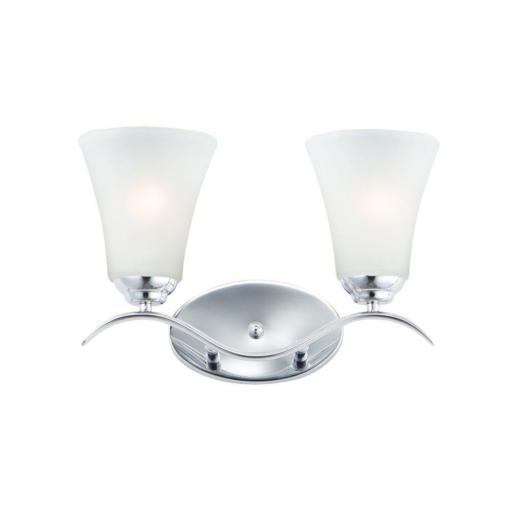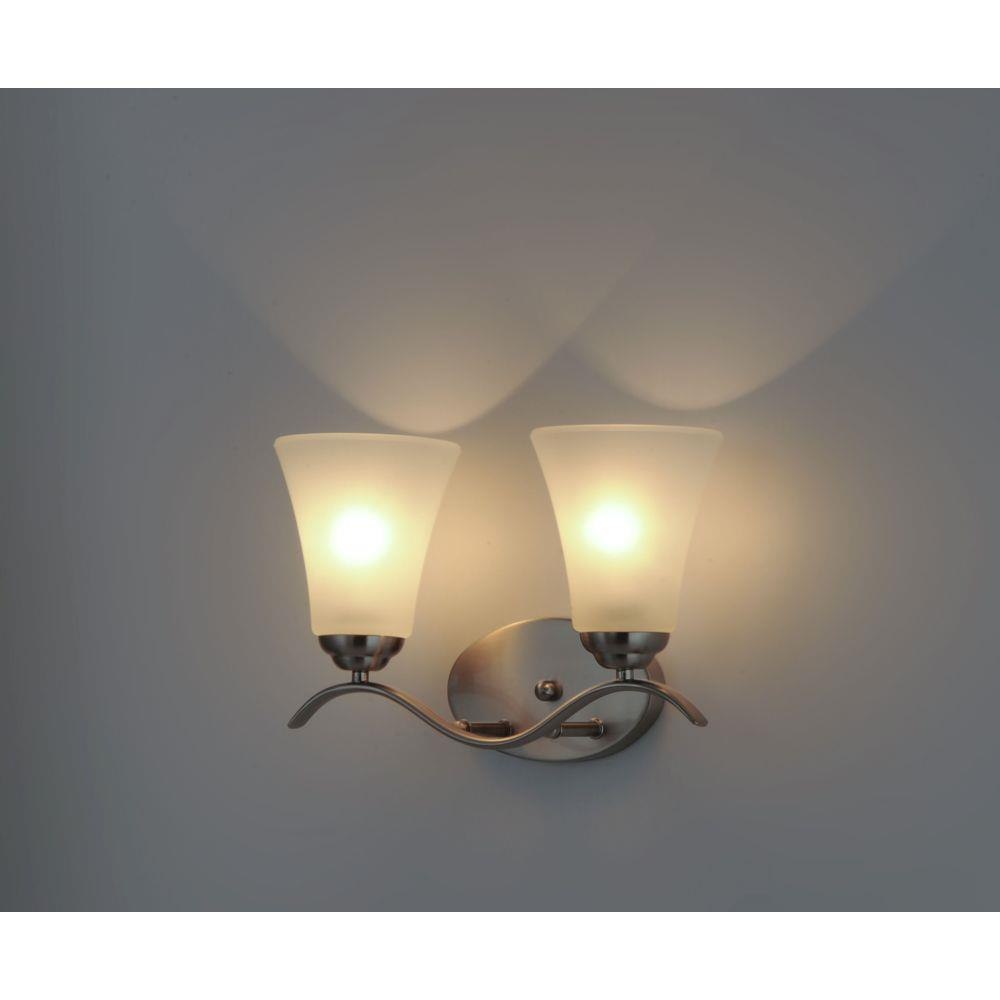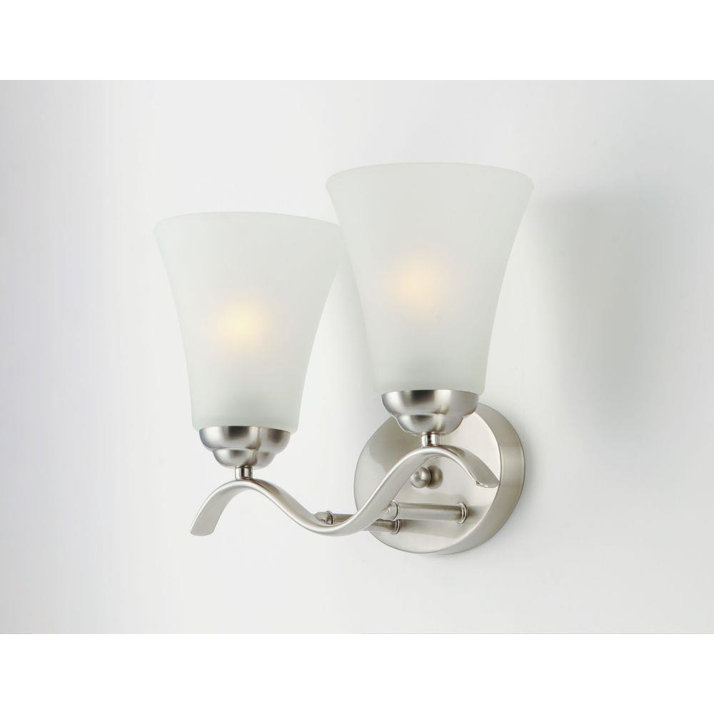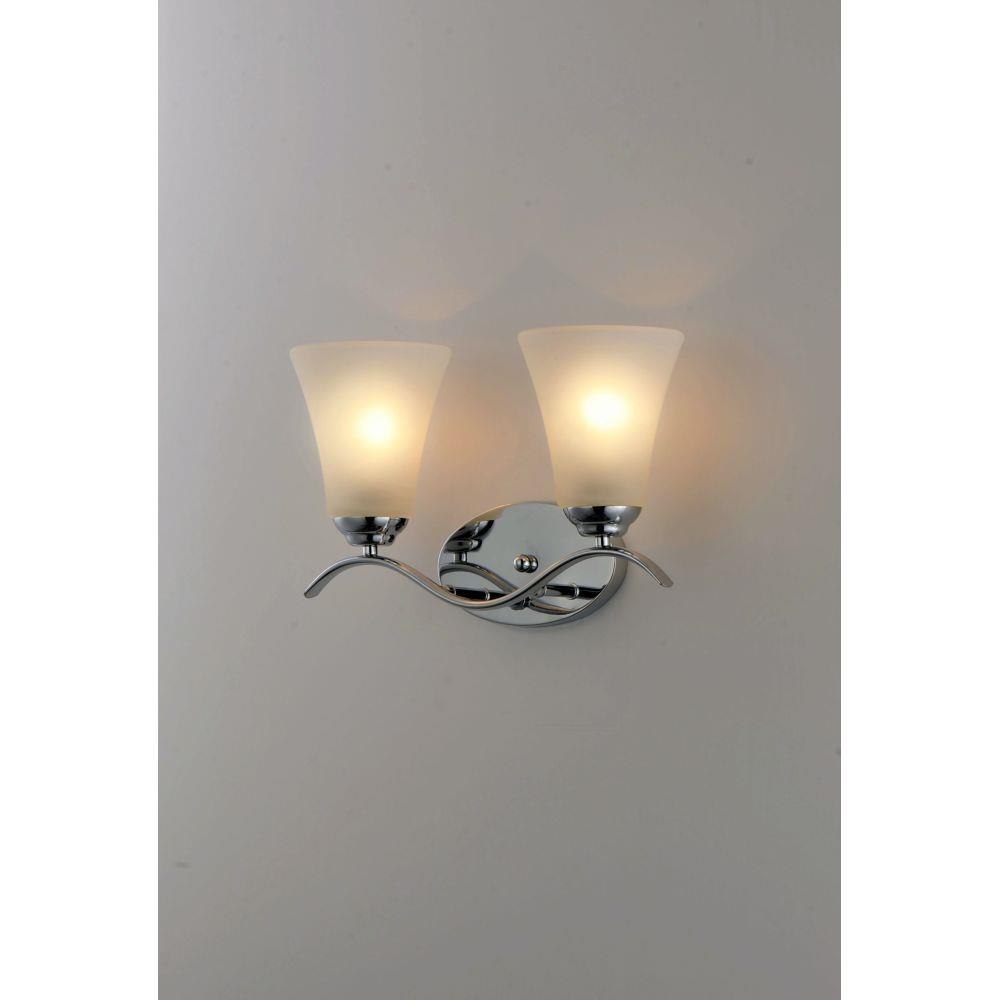 Gently waving arms of Satin Nickel or Oil Rubbed Bronze support tall-profile Frosted glass shades creating a scale normally not found in this category of lighting. The bath vanity may be installed up or down and also includes a Polished Chrome finish.