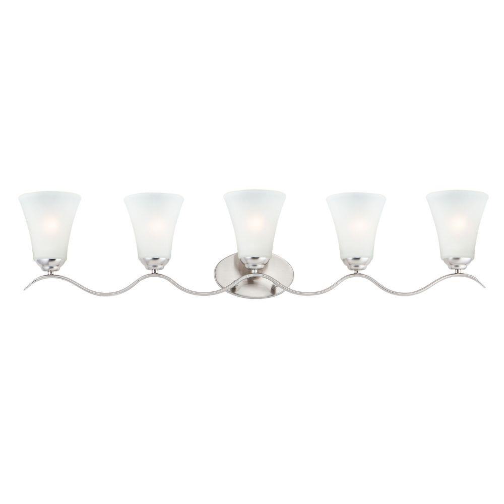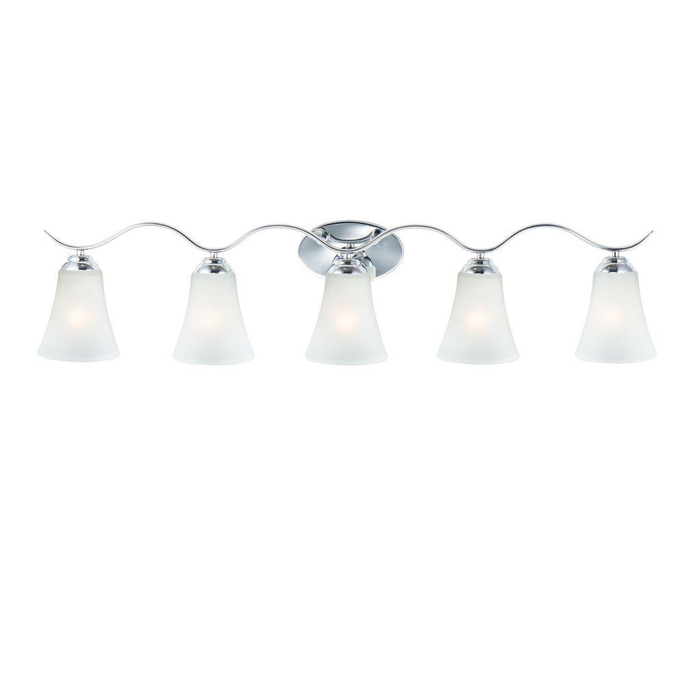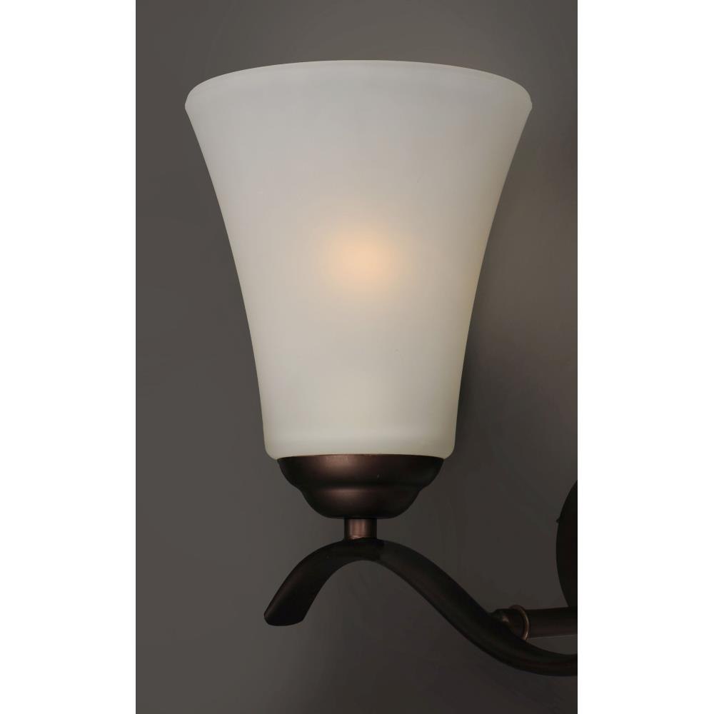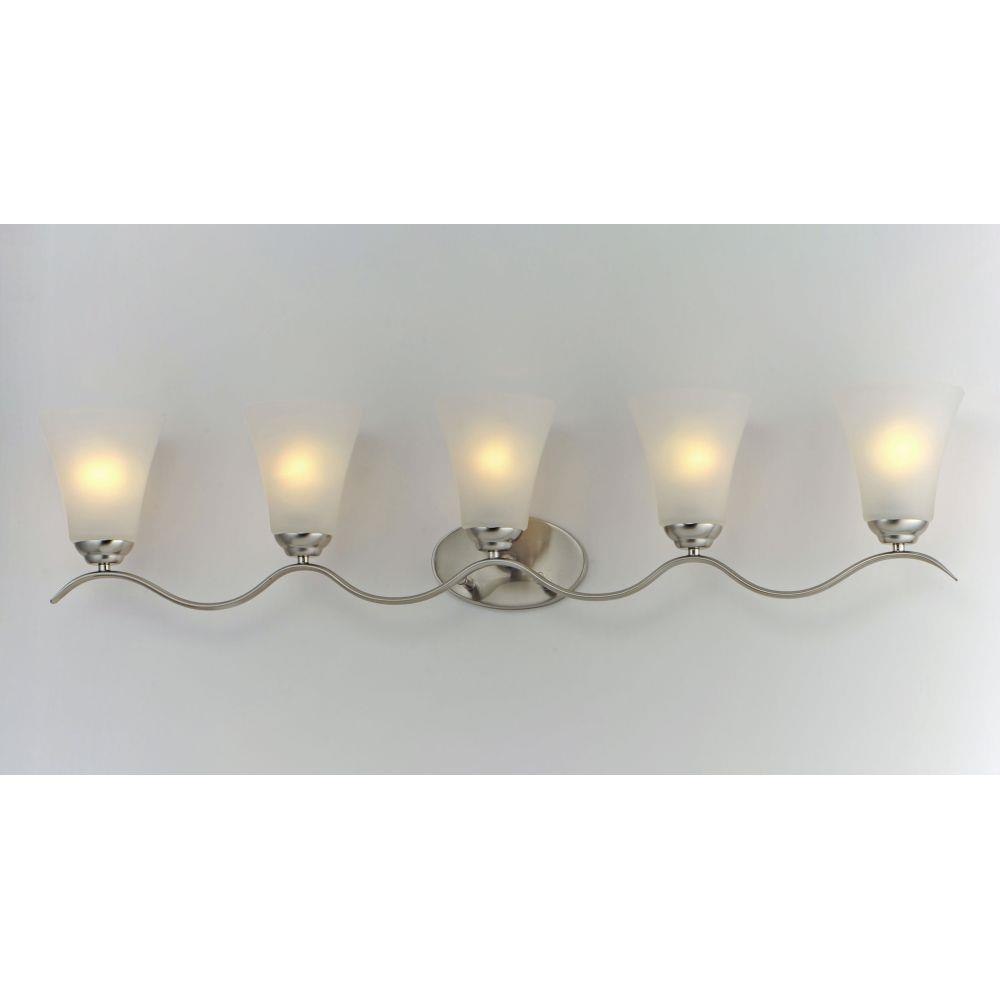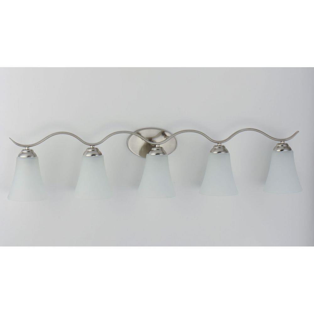 Gently waving arms of Satin Nickel or Oil Rubbed Bronze support tall-profile Frosted glass shades creating a scale normally not found in this category of lighting. The bath vanity may be installed up or down and also includes a Polished Chrome finish.