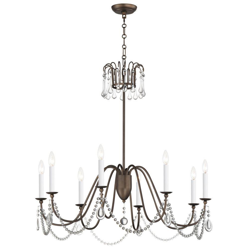 Sweeping metal accents links create classic curves on a minimalist chandelier. Available in hand-rubbed Chestnut Bronze or elegant Gold Leaf finishes. Add crystal accents to elevate the design for a more extravagant glamour. The design manages to evoke French Country charm and enchants any room it illuminates.