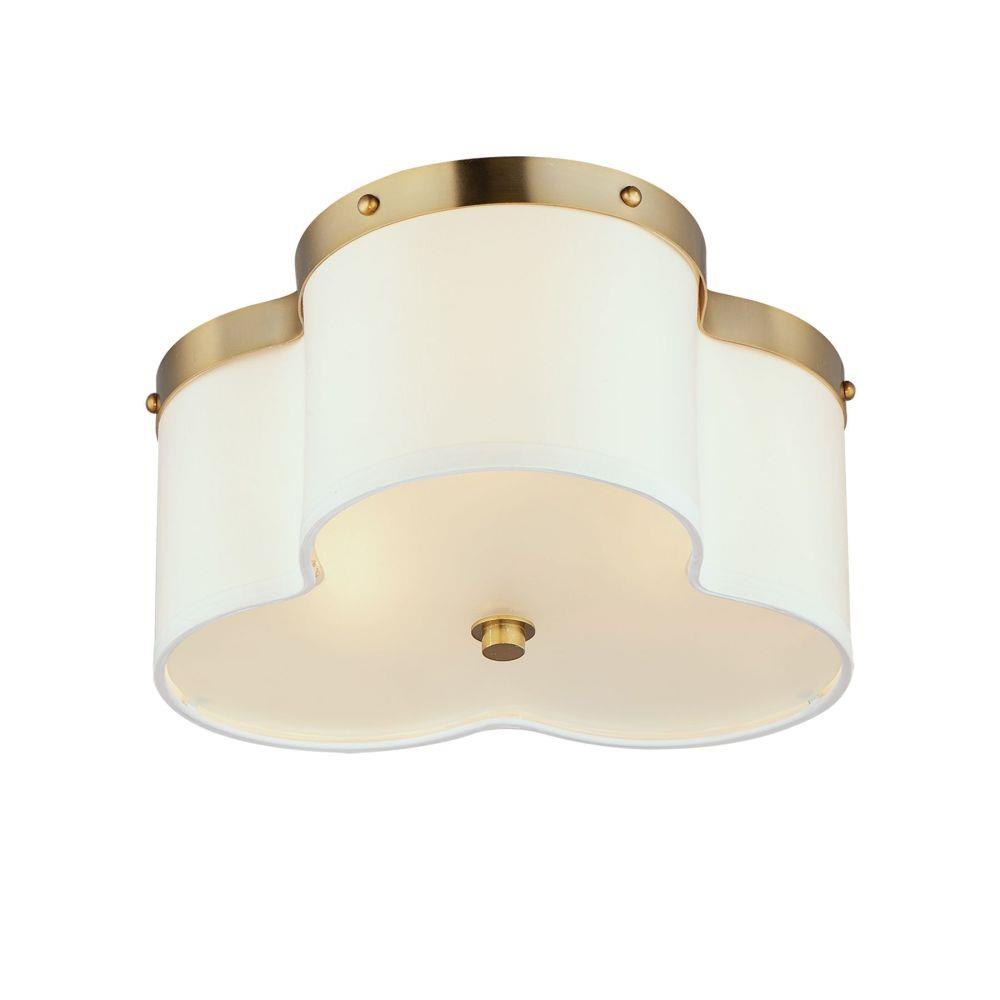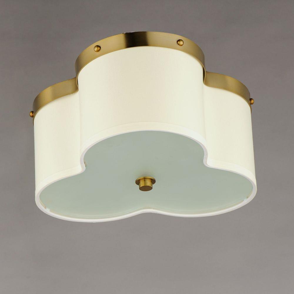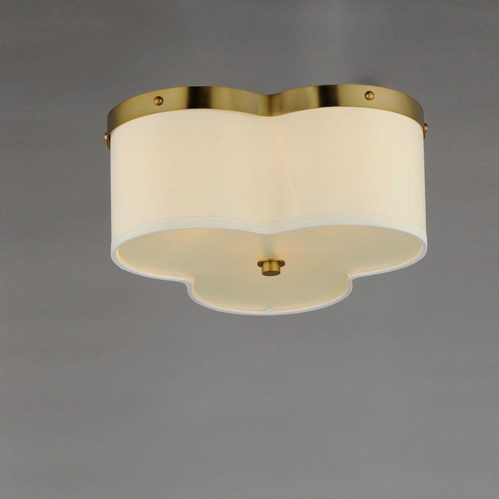 A classic scalloped fabric shade with decorative metal trim and rivets. Using an Off-White linen fabric shade, and accented with Aged Brass metalwork, this design is timeless and elegant.