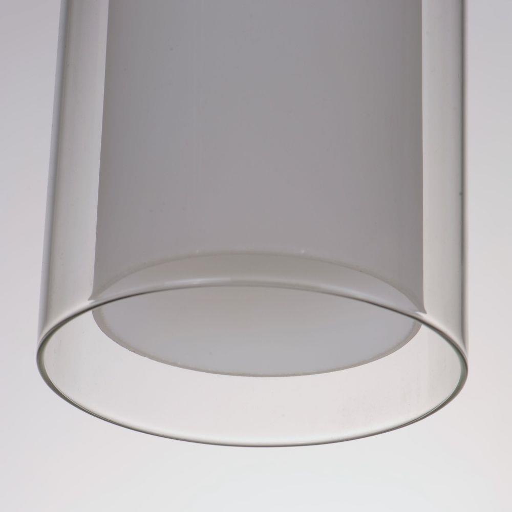 A double glass shade advances the double shade design with the integration of sleek and modern integration of design. Satin White inner glass shades are surrounded by a transparent Clear outer glass, available in your choice of Satin Nickel or Black finished base and supports.