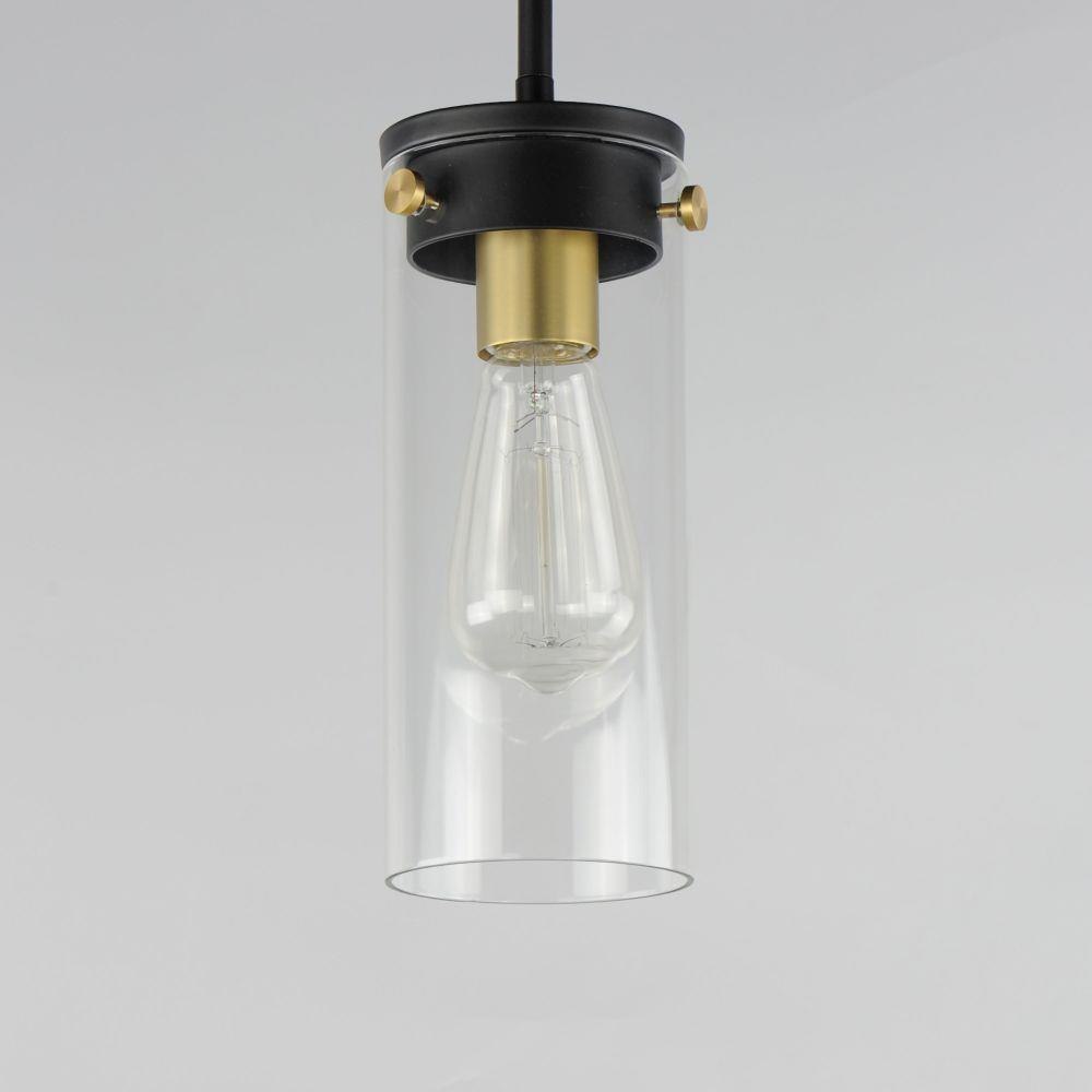 Simple clear glass cylinders are secured by decorative thumb screws in this transitional collection of sconces and pendants both neutral in design and suitable for damp applications. Choose from Satin Nickel or a two-tone Black and Satin Brass finish to pair with popular interior finishes in hardware, plumbing and decor.