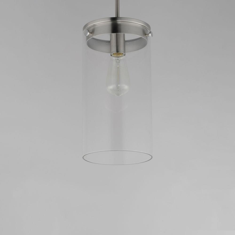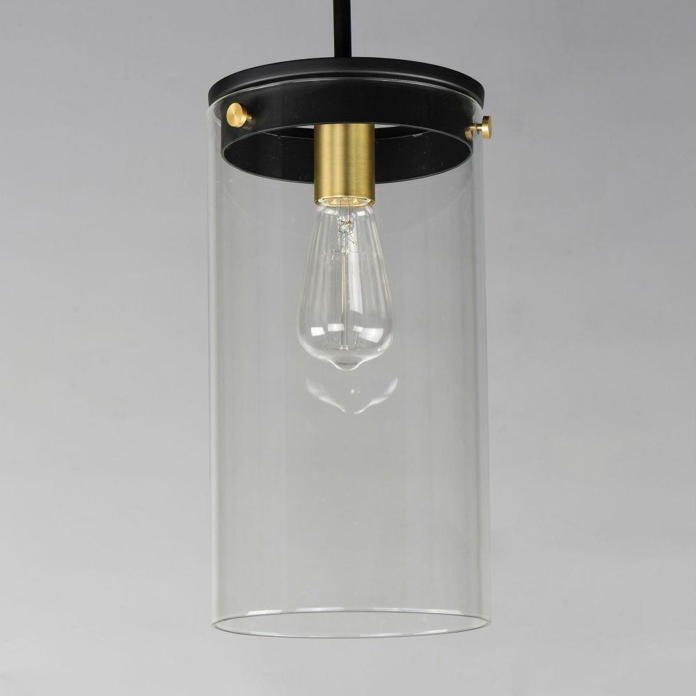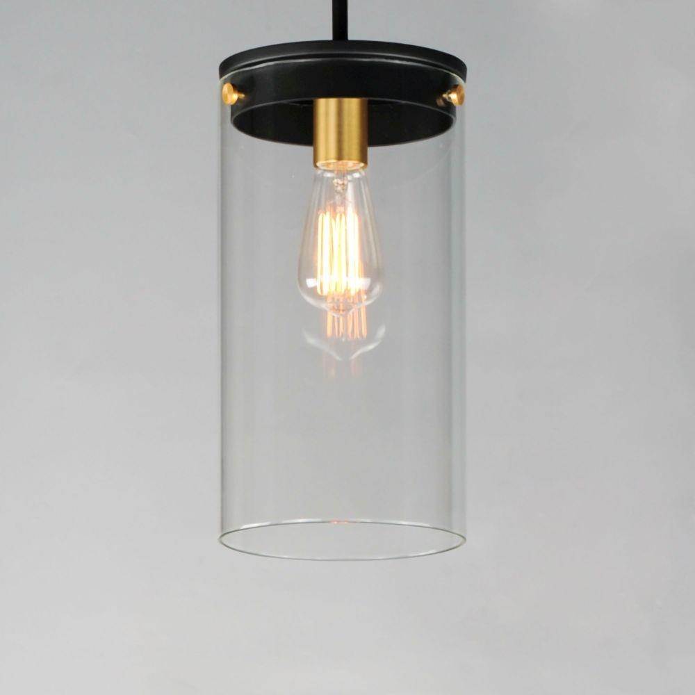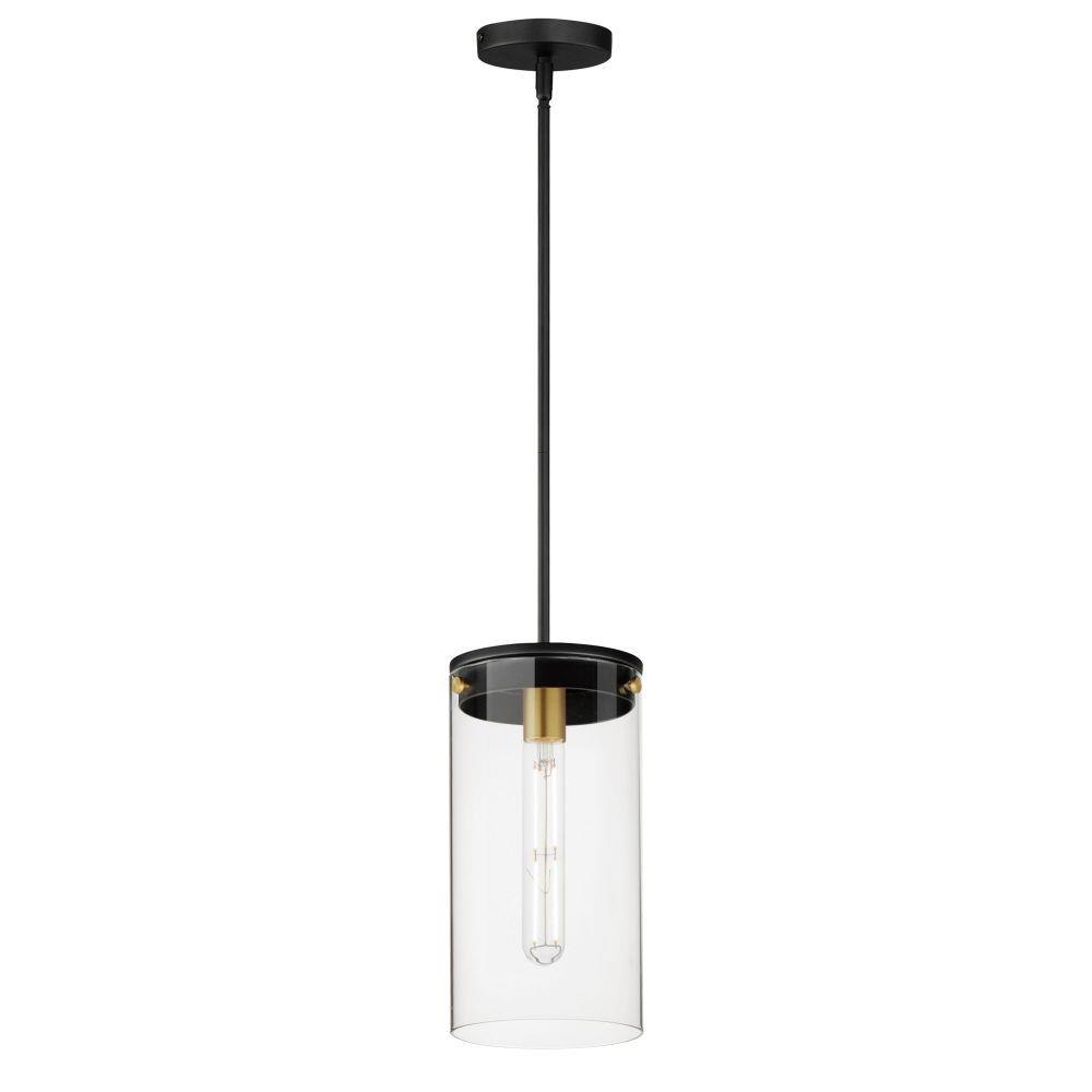 Simple clear glass cylinders are secured by decorative thumb screws in this transitional collection of sconces and pendants both neutral in design and suitable for damp applications. Choose from Satin Nickel or a two-tone Black and Satin Brass finish to pair with popular interior finishes in hardware, plumbing and decor.