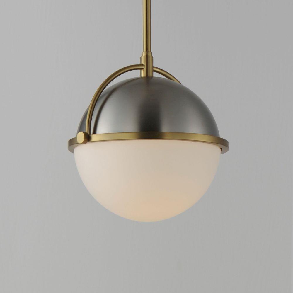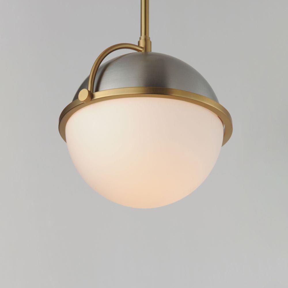Tasteful globes constructed of metal and glass halves are combined and suspended by an arc-shaped yoke structure. The top dome of robust steel support lower halves of Satin White glass shades that twist lock on for convenience of installation and maintenance. Available in Matte Black with contrasting Weathered Brass or Satin Nickel with Satin Brass two tone finishes, the series includes a full range of products including flush mount, semi-flush mount, single and multi-pendant configurations, and spec-worthy sconces. This attractive design is sure to enhance your projects most needed spaces with an enduring appeal to the design that works in a variety of aesthetics.