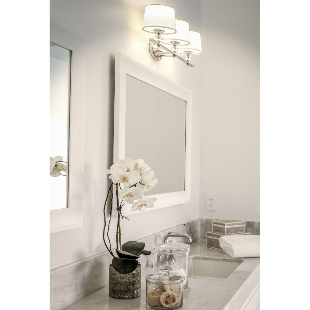 Exemplary transitional styling, the Rondo collection takes a classic shaded design and updates it with contemporary finishes and delightful glass orb details. The sharpness of the Polished Nickel frame is softened with the use of round crystal glass balls. The White hardback fabric shades are fit with frosted diffusers so the light is even and soft while concealing the bulb.