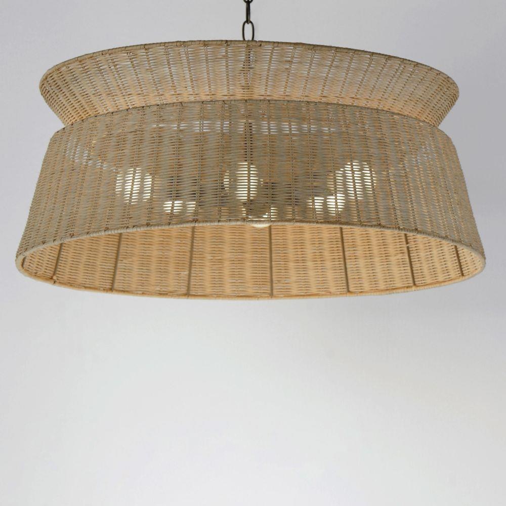 Woven bamboo strips are used to make a layered coastal pendant. Light escapes between the gaps in the material that is woven by hand that has a homespun warmth and natural appeal.