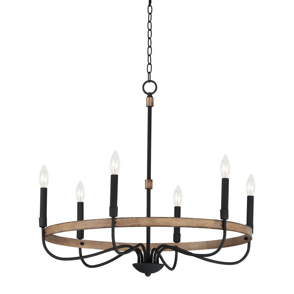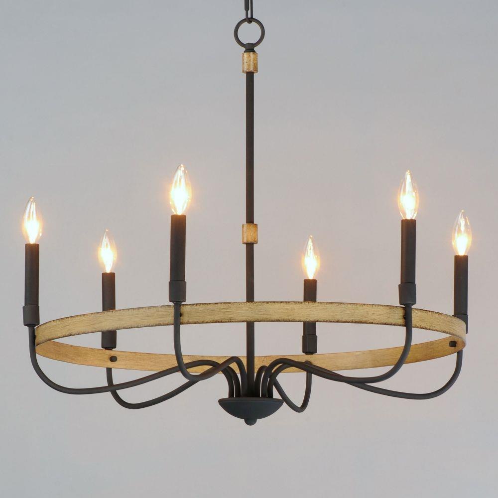 Rustic charm in an elegant, yet simple chandelier with warm distressed wood finishes and textured black metal arms. White candle covers evoke wax candles to complete the classic and transitional appeal of this series. The flush mount features a satin white diffuser to soften the lamps within.
