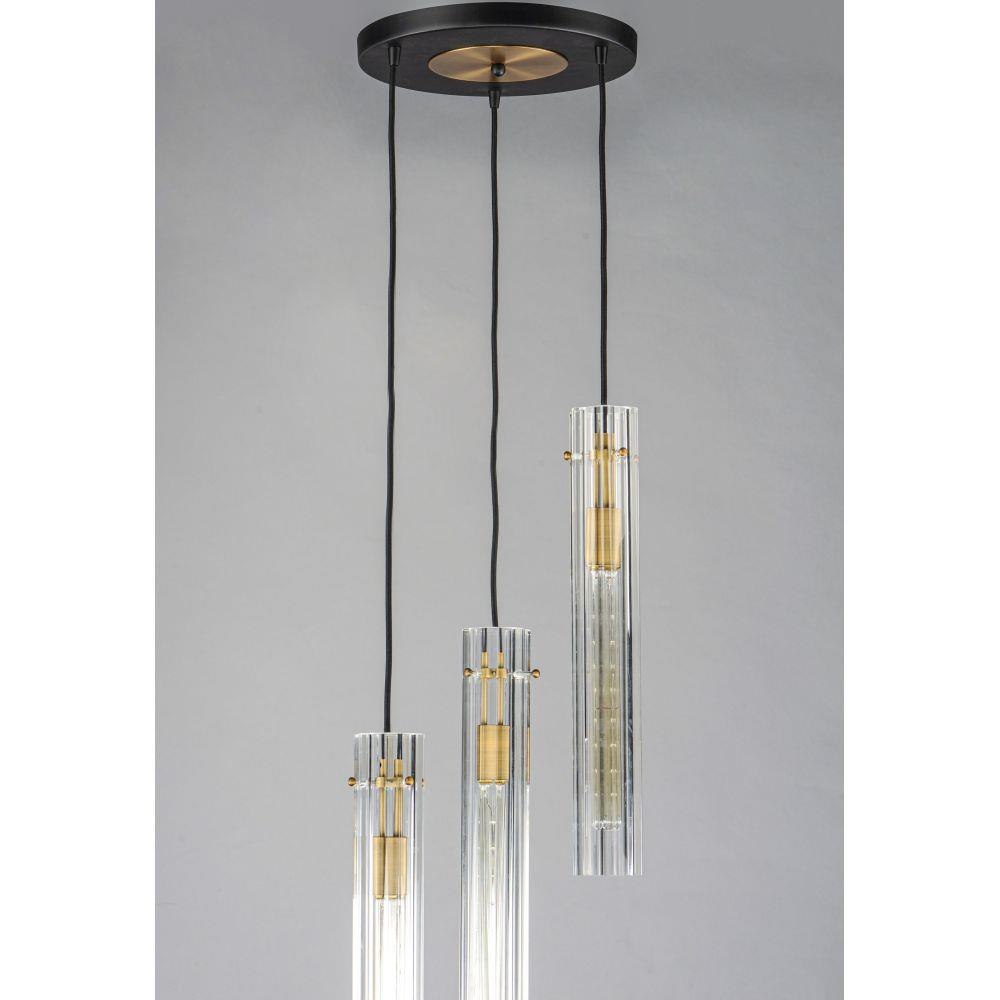An exquisite collection featuring scalloped cylindrical Clear glass shades on unique metal frames finished in a combination of Black and Antique Brass. The cascading design of the chandeliers can be paired over a dining table or used as an entry fixture.