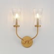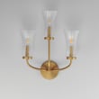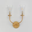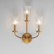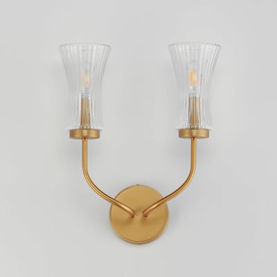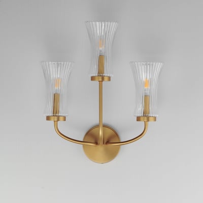 The Camelot Wall Sconce enhances your space with its transitional design, blending classical elements with modern elegance. This wall-mounted fixture showcases clear ribbed glass shades and a natural aged brass finish, making it a versatile addition to any room.