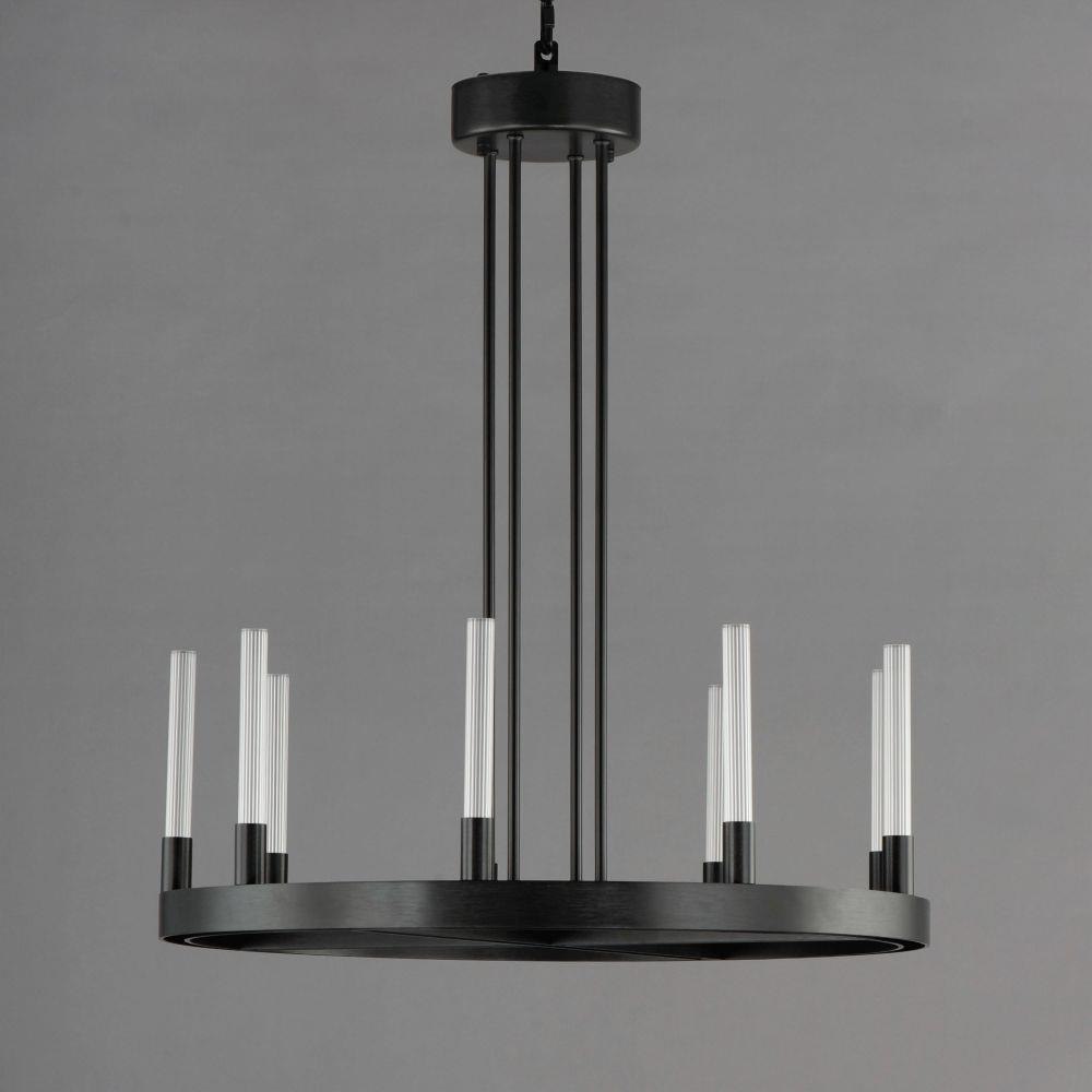 A modern tribute to the wheel chandelier, the Ovation collection integrates LED technology for a dazzling lighting effect. The LED light produces a shimmering lighting effect along the tall and narrow fluted glass shades adding celebratory effervescence. The expansive diameters of the rings join at the center in equipoise using four down rods to suspend the frame. Mount the chandelier from the collector or make use of additional chain supplied to extend the height with ease. Additional sconces with up and down lighting complete the design. Available in Brushed Brass or Black, the collection toasts a classic design creating an elegant statement.
