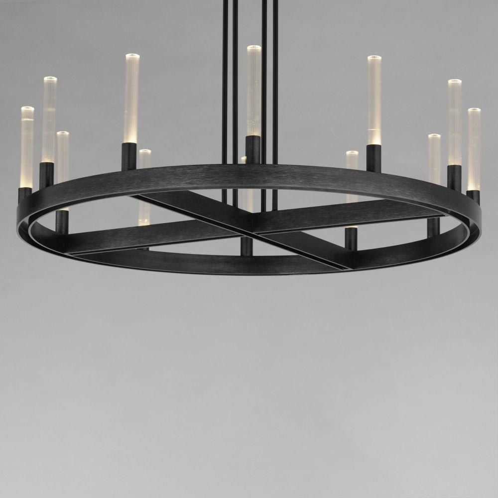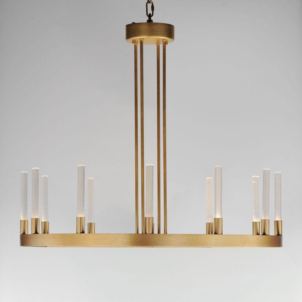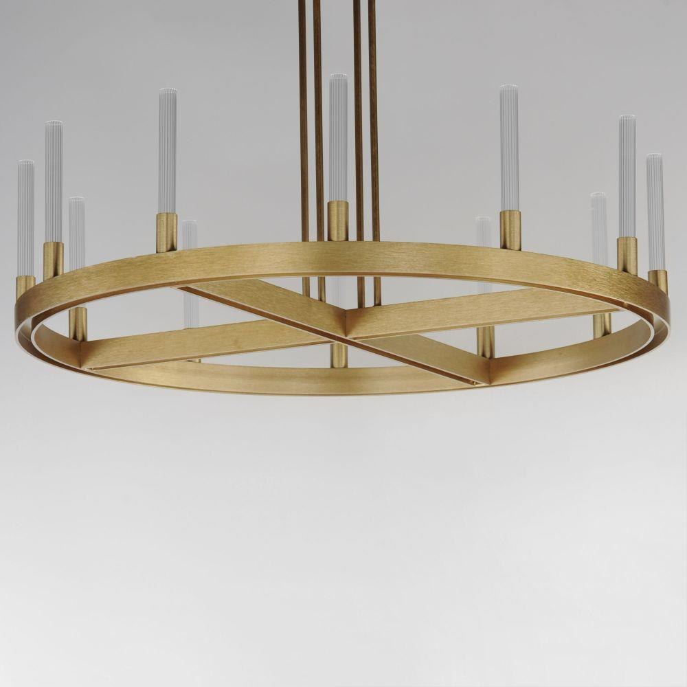 A modern tribute to the wheel chandelier, the Ovation collection integrates LED technology for a dazzling lighting effect. The LED light produces a shimmering lighting effect along the tall and narrow fluted glass shades adding celebratory effervescence. The expansive diameters of the rings join at the center in equipoise using four down rods to suspend the frame. Mount the chandelier from the collector or make use of additional chain supplied to extend the height with ease. Additional sconces with up and down lighting complete the design. Available in Brushed Brass or Black, the collection toasts a classic design creating an elegant statement.