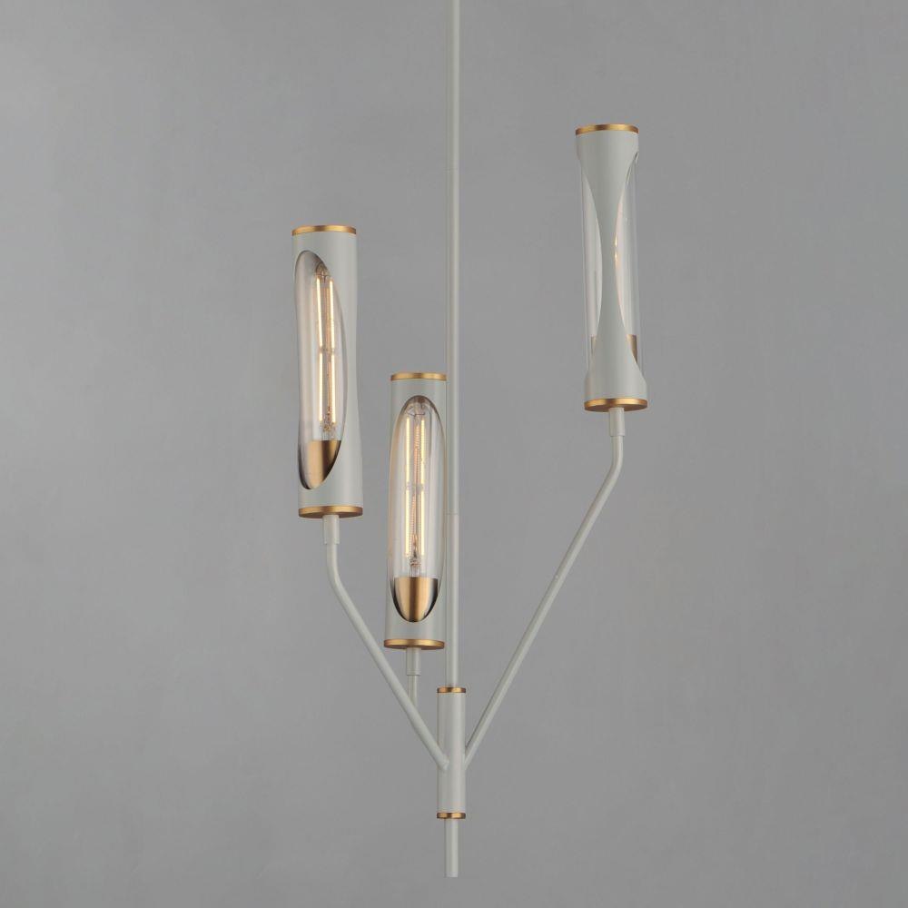 Glamourous and modern, this two-toned lighting collection plays with form and scale. A layered composition of materials, tubular lamps are protected within glass tubes sheathed in metal shades with oval cut-outs that reveal the light source. Chandelier Arms extend in elongated, uneven heights while the sconces are over-scaled for dramatic applications. Available in contrasting finish combinations of Light French Grey with Natural Aged Brass or Matte Black with Antique Brass, the vibrant color palette plays with contrast and exudes luxury.
