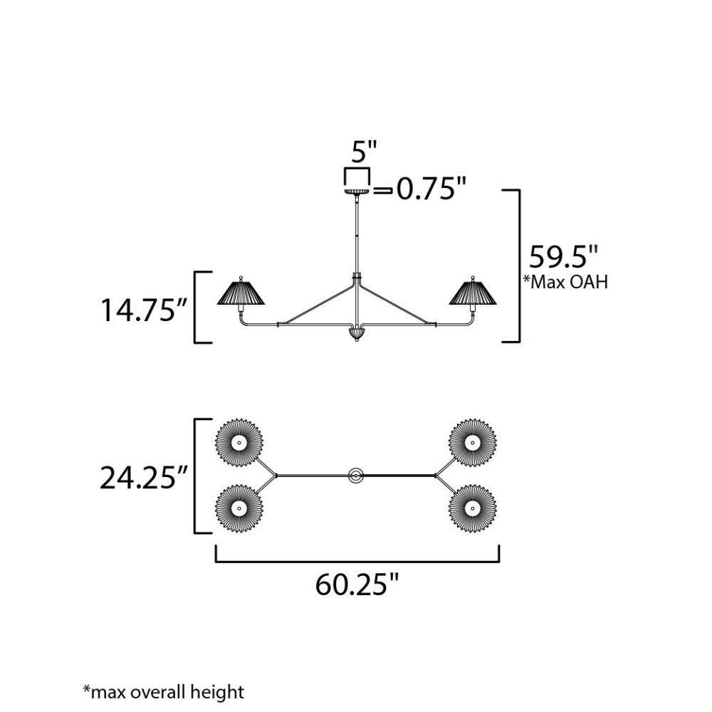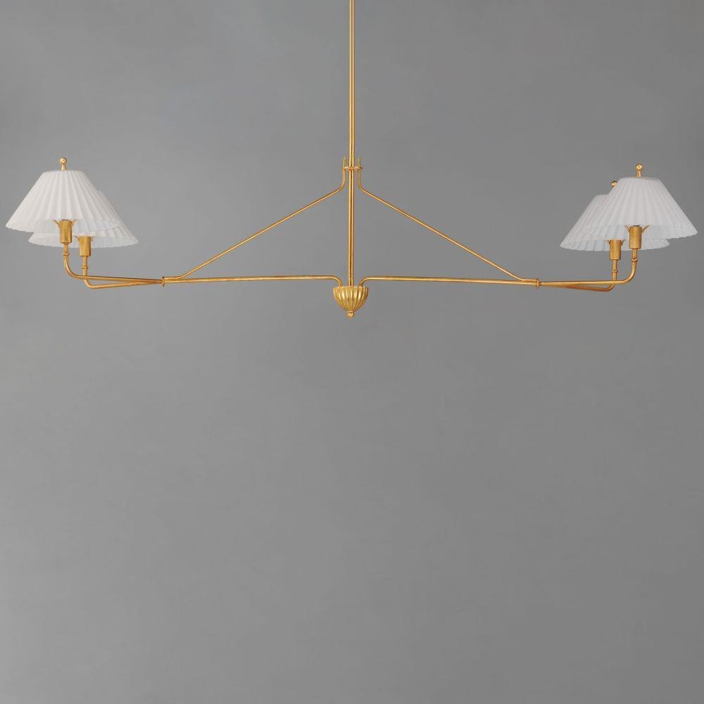 Touches of biophilic details and charming Satin White glass shades modeled on pleated fabric shades create elegant and approachable lighting fixtures. Finished in a rich hand-applied gold leaf, the elongated frame of the chandelier and upturned sconce takes on unique proportions. This collection was designed in collaboration with the eponymous design duo, Kismet House, whose style is embodied in the nostalgic details represented in the shapes, finishes, and overall concept.