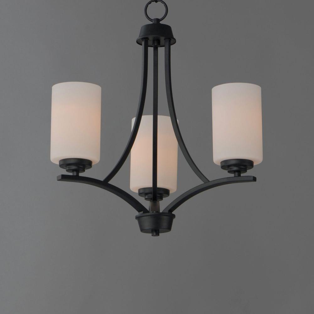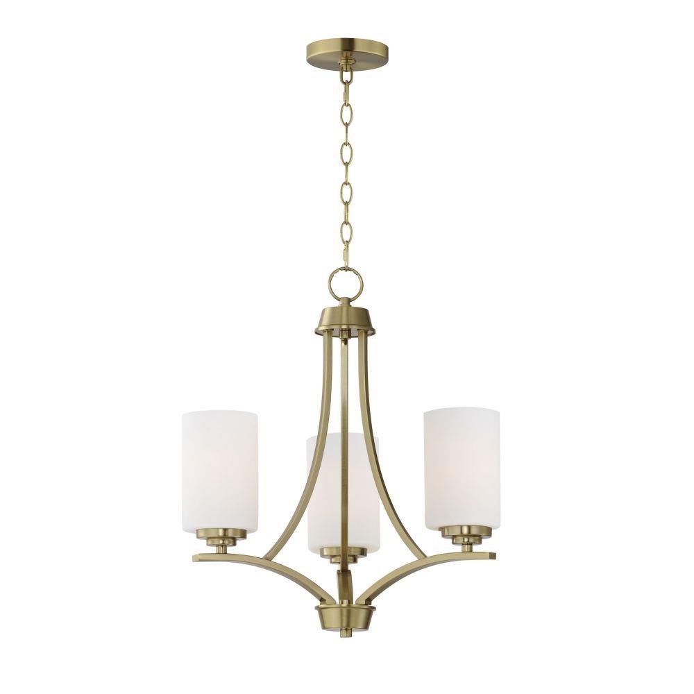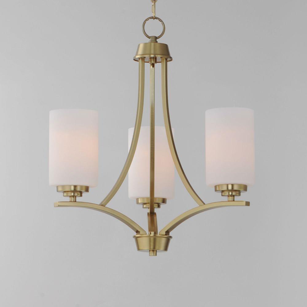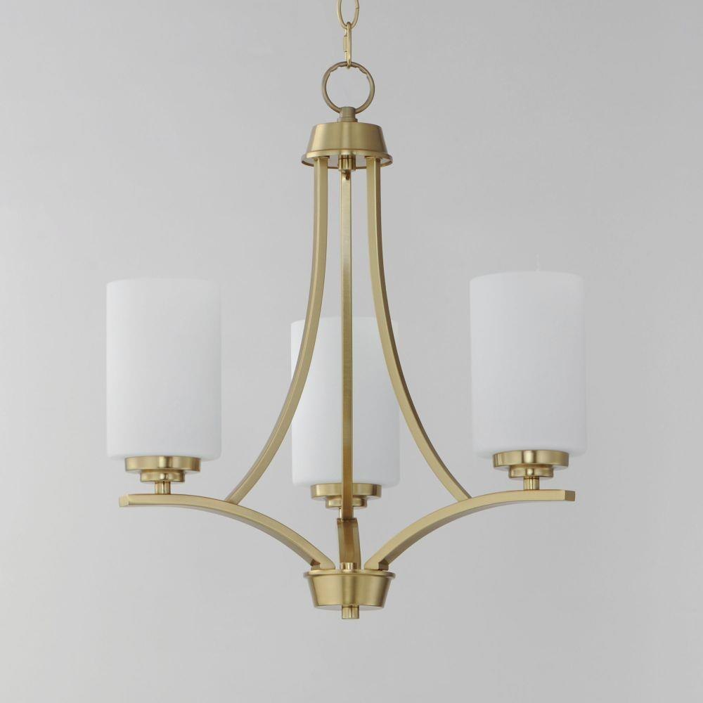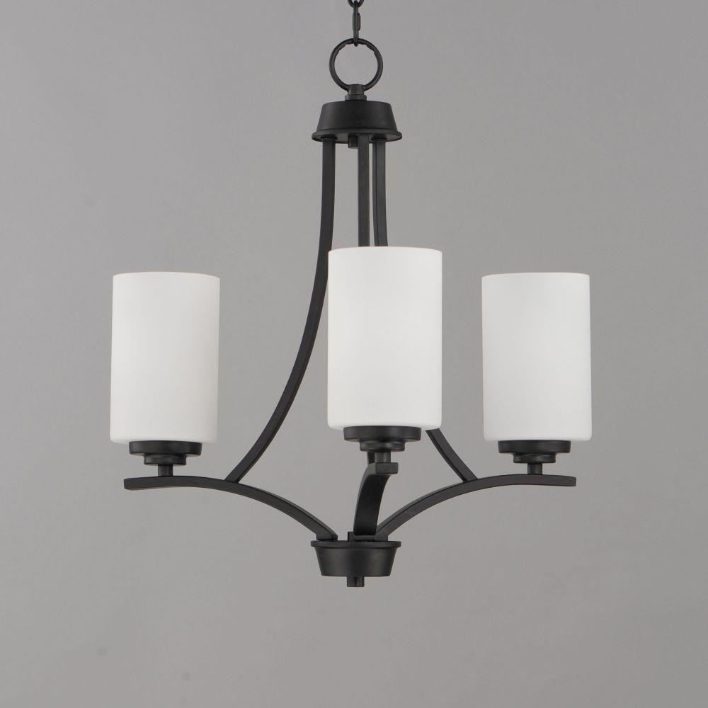 Low sloping arms of rectilinear tubing is finished in a variety of options that include Satin Nickel, Oil Rubbed Bronze, Matte Black, and a contemporary Satin Brass finish. Tall, cylindrical Satin White glass shades soften the light source within. Offered in a variety of configurations that include chandeliers, sconces, and a semi-flush pendant that may be used as a foyer pendant, has become a proven popular choice among builders.