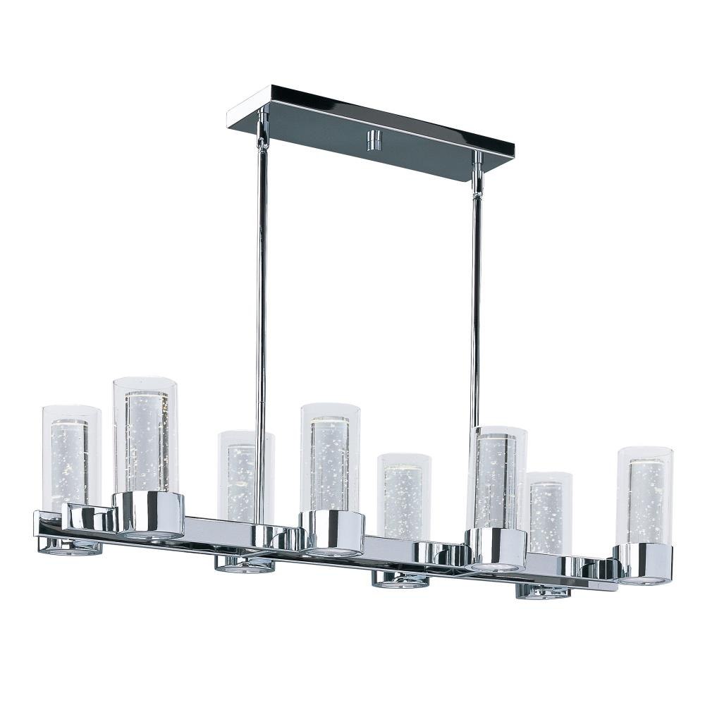 Rods of bubble glass are encased inside a Clear glass cylinder, which are supported in a cast Polished Chrome frame. Dual LED modules bring the bubble glass to life, while also providing ample illumination to the surface below.