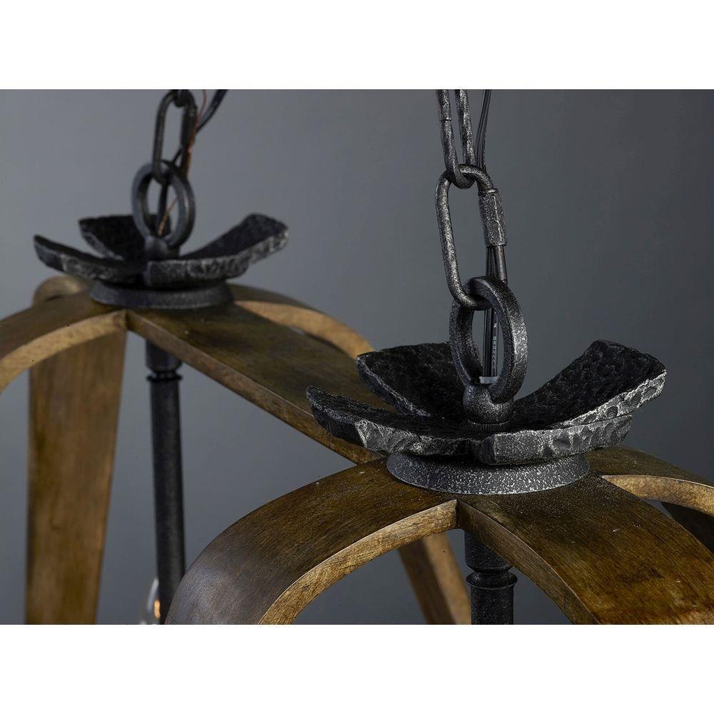 Unique pendants formed of bent wood finished in Barnwood which is a weathered and distressed look. The internal clusters and details are constructed of cast iron in a hammered pattern and finished in a natural looking Iron Ore. A excellent blend of soft shape and rustic finish allows for this collection to fit into a number of interior designs.