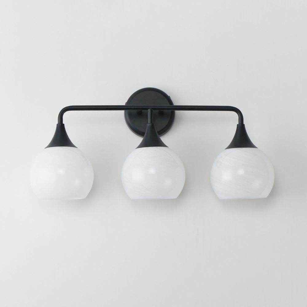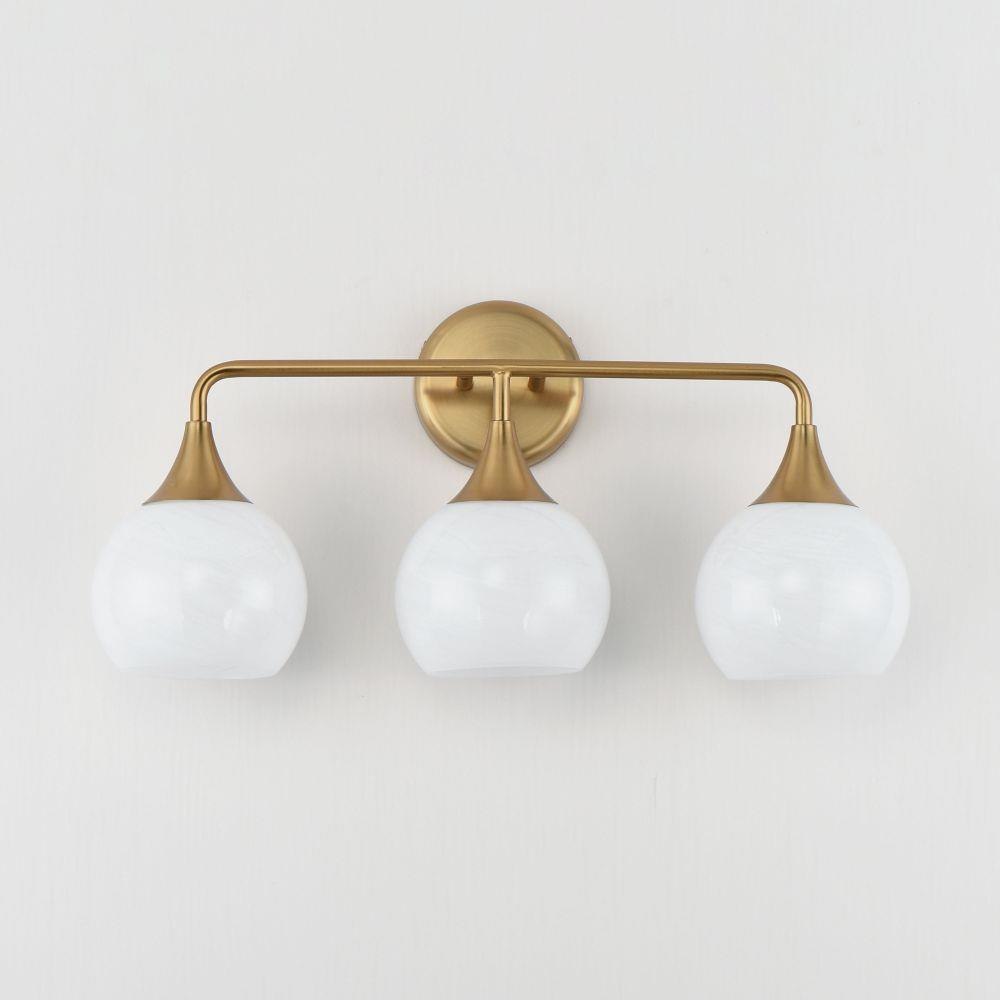 Featuring a swirling white Marble Glass globe that encases the light source, the shades are reminiscent of snowglobes. The collection provides a wonderfully wintery composition that is timelessly elegant effortlessly sophisticated. Choose from multiple sizes of the bath vanity lights as well as a larger glass pendant or flush mount options. Available in Natural Aged Brass, Polished Chrome, or Matte Black.