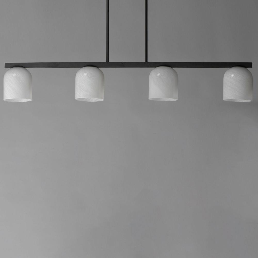 Cut-out metalwork curves around modern bell-shaped glass shades. The series includes pendants and bath vanities available in either Clear or a swirling Marble glass. Available in various complementary finishes: Polished Chrome, Matte Black, or Natural Aged Brass these fixtures make a delightful addition to bathroom spaces, bedrooms, or over a kitchen island.