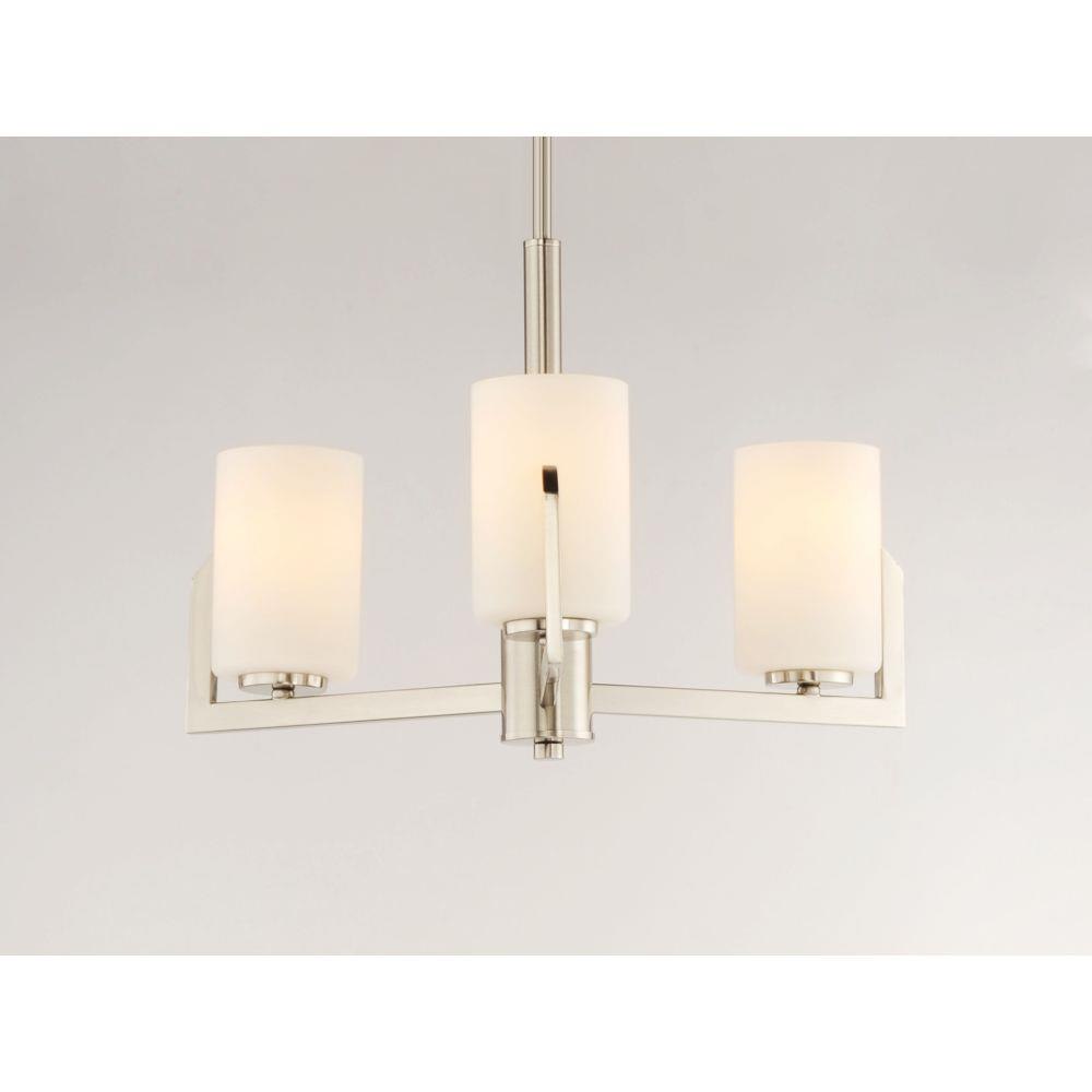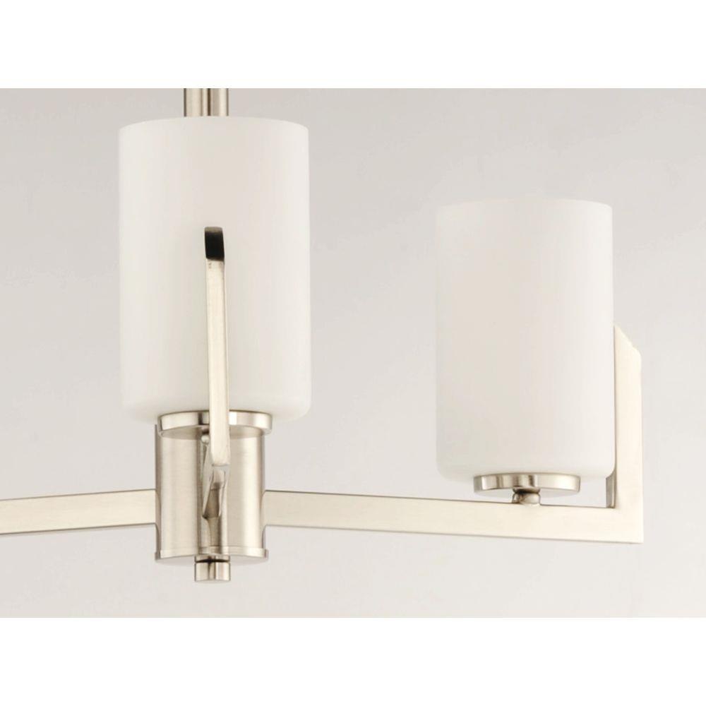 Inspired by the Modernist architect Edward Dart, this collection features straight line frames finished in Satin Brass or Satin Nickel that support Satin White glass cylinders for a clean and modern look. The end of the frames turn up and end in an angle emphasizing a minimalist geometry popular in Modernist work.