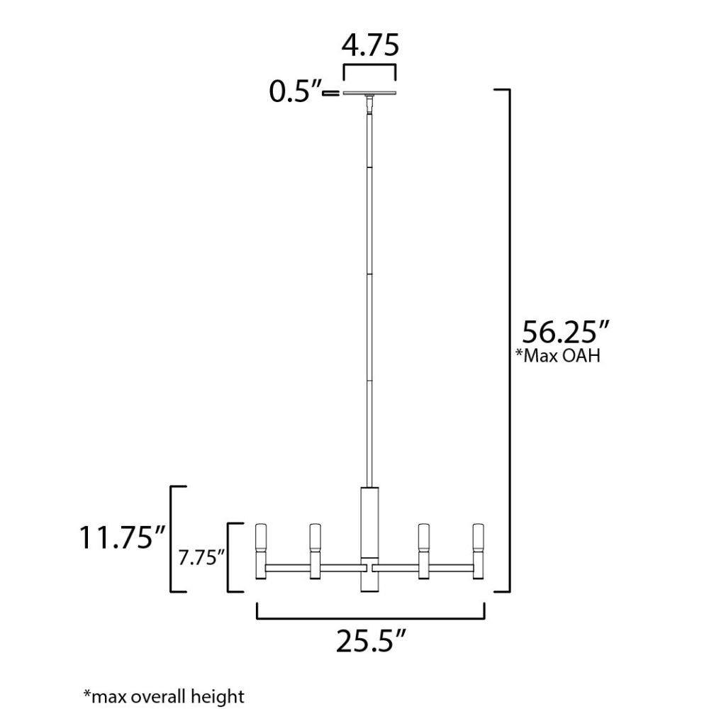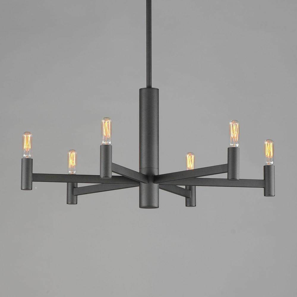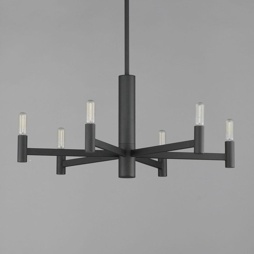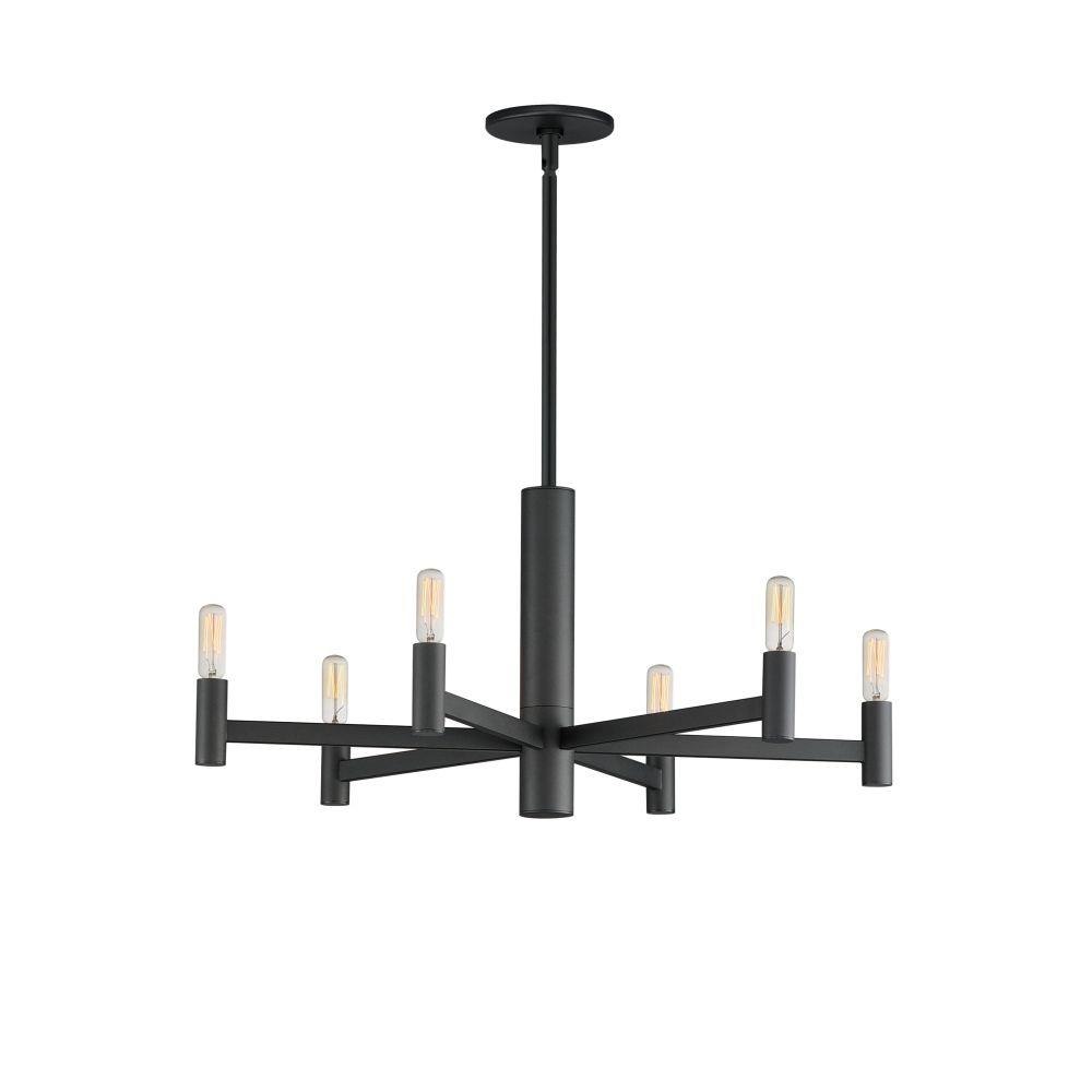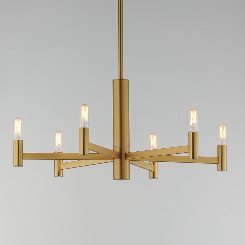Straight extensions of rectilinear arms emanate from a cylindrical center housing in this transitional design. The candelabra is made in a corresponding cylindrical form playing into the geometries of this streamlined chandelier design. Available in a textured sandy Black or Natural Aged Brass, this collection pairs well with many design aesthetics at an economical price point. Use tubular lamps for an industrial or more modern aesthetic or torpedo shape for an update to the conventional chandelier design.