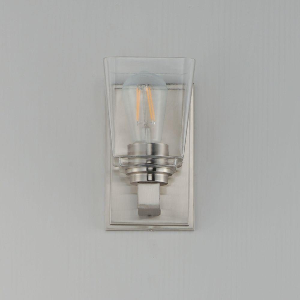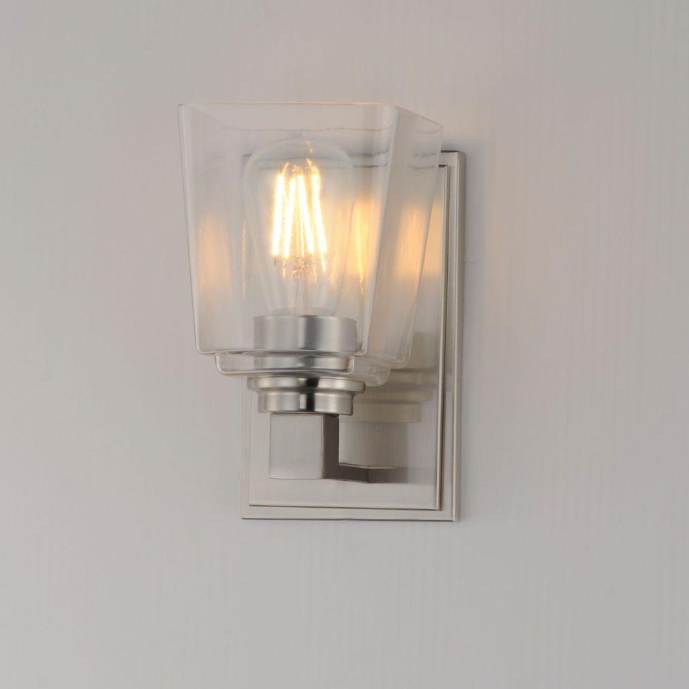 A composition of square forms that feature a Clear tapered square glass shade, these bath vanities provide a transitional design that suits both modern and traditional spaces. Available in Matte Black, Polished Chrome, Satin Nickel, and Natural Aged Brass.